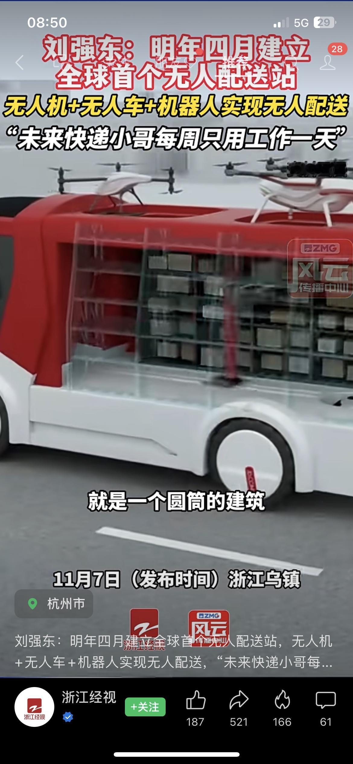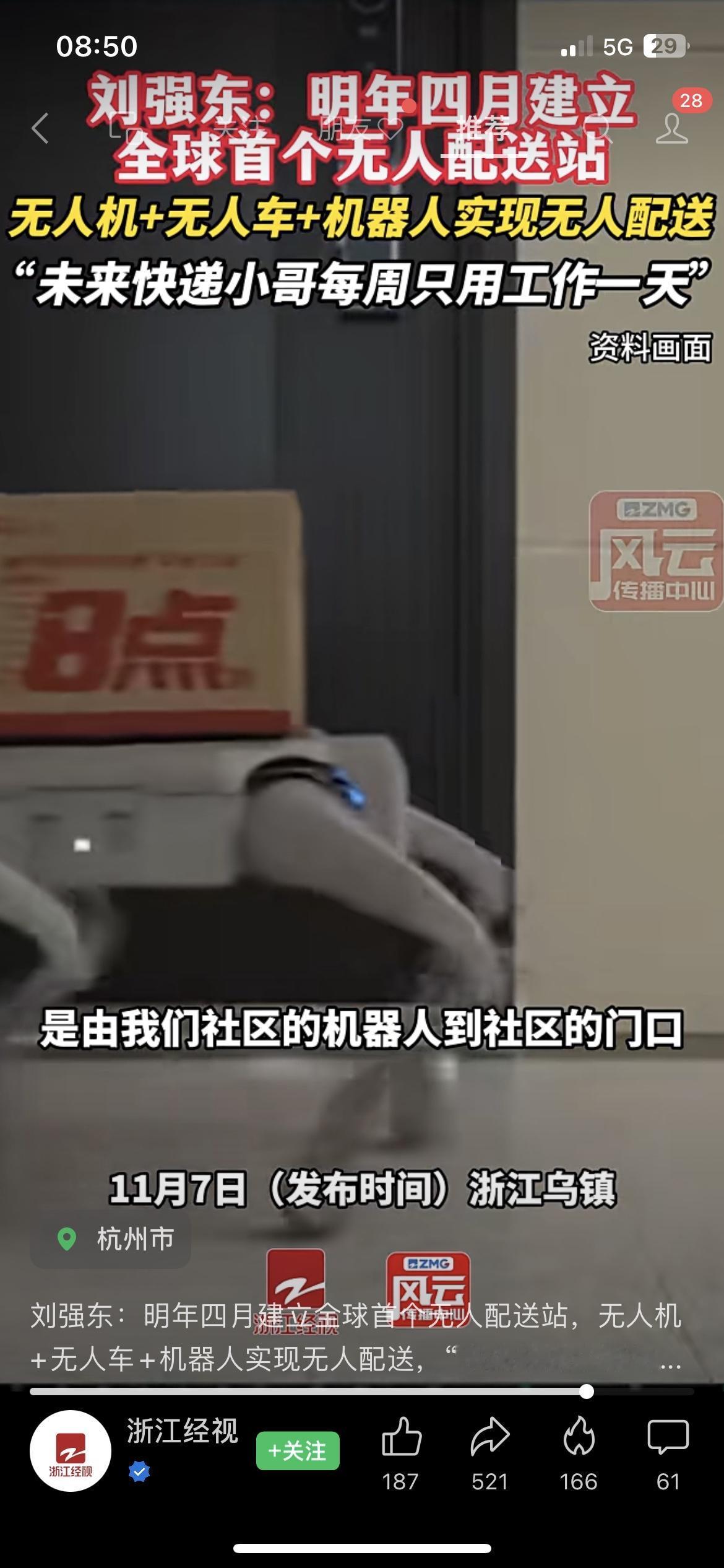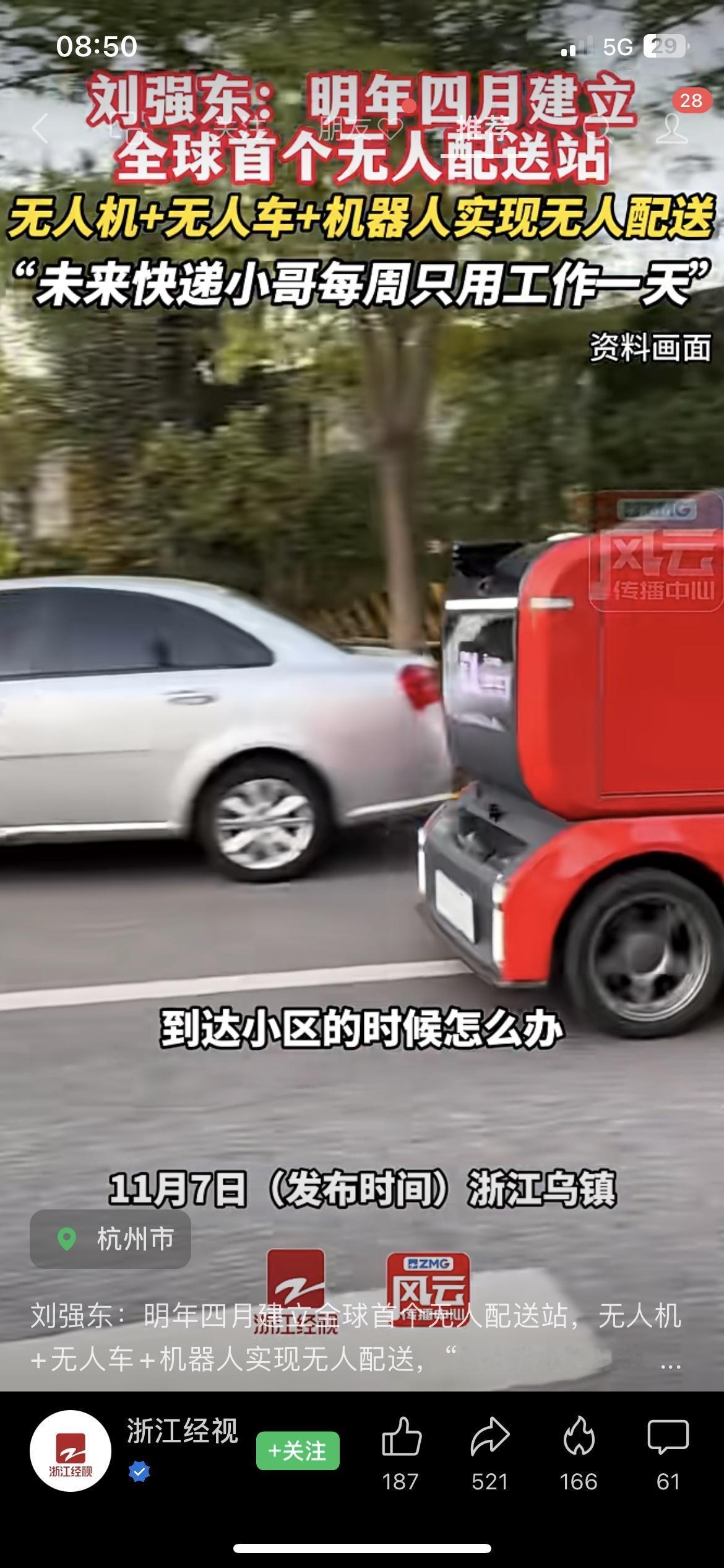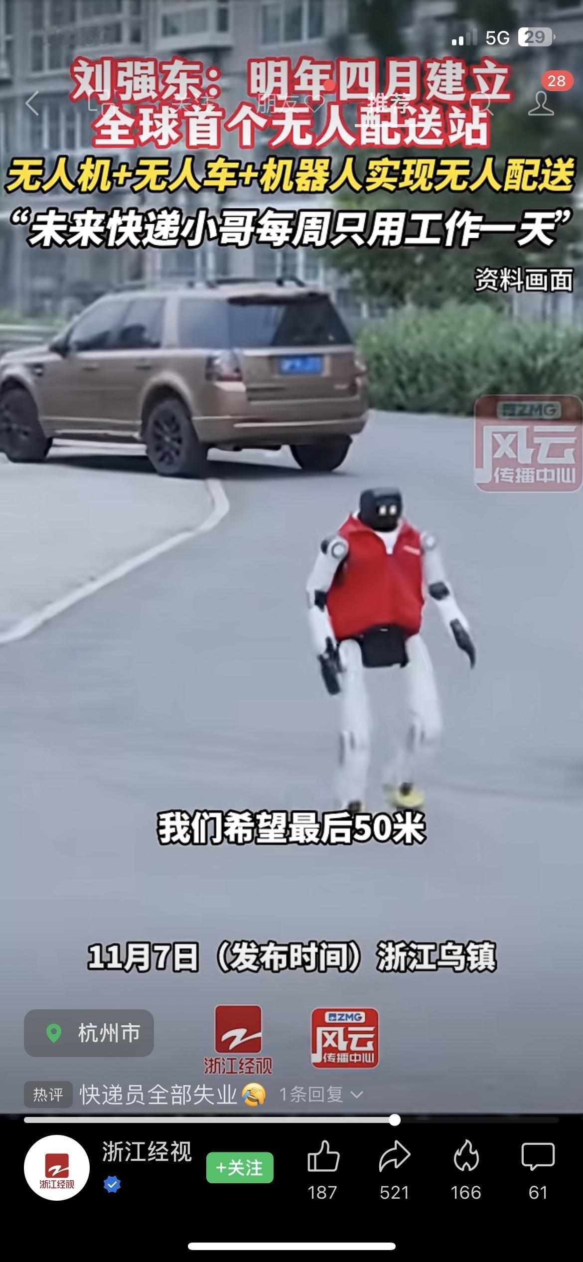 明年4月!快递员每周只干1天? 刘强东刚放话:明年4月建全球首个无人配送站,无人机+机器人送快递,说以后快递员每周只上1天班! 以后取件直接跟机器人对暗号?下雨天再也不用等小哥淋着送件——就是这机器人能找着你家单元门不? 你敢让机器人送你快递不? 赶紧转你常网购的闺蜜,以后收包裹可能要“对机器人say hi”了!