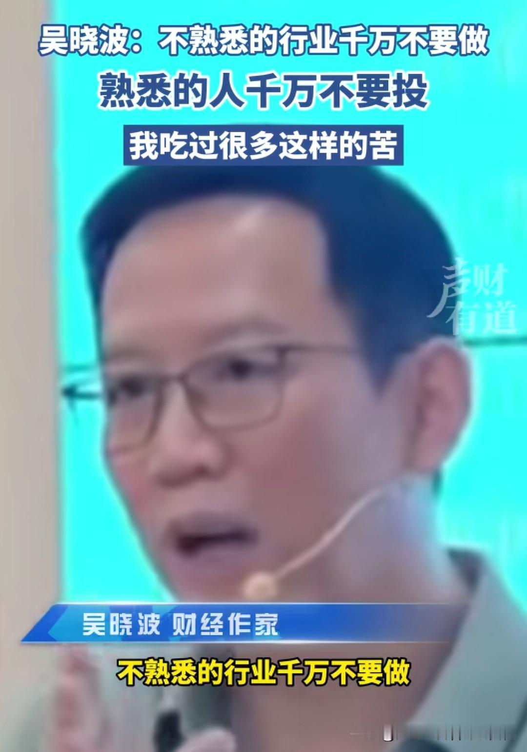 大家记住财经博主吴晓波这句话:“不熟悉的行业千万不要做,熟悉的人千万不要投。”不熟悉的行业,你去做了,会有很多坑,会有吸取不完的教训,代价就是你要付出大量的时间和精力,以及不知道都花哪里去了的金钱。 和熟悉的人合作,是没有任何溢价的,而且熟人完全没有必要用利益去讨好你,她们甚至还想坑你,因为了解你,坑你完全没有太多成本,一忽悠一个准。 而陌生人可能给你利益来证明自己,这就是你想要的,也是你期待的结果,利益面前都好算账,即便对方想坑你,但凡你感觉稍微有点不对头都可以拒绝,要是面对熟人就没那个警惕和防备心了。