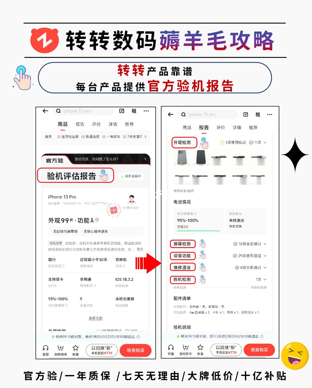 ✨转转提供的【官方验】服务,每一部数码产品都经过严格检测,从电池健康到外观状况,再到各项功能及配件详情,一应俱全的验机报告让你一览无余。