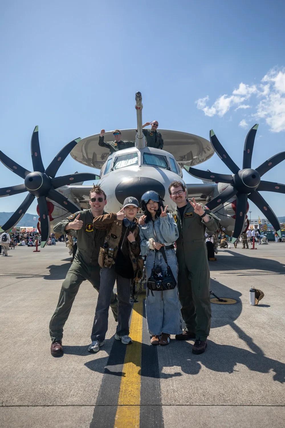 日本岩国海上自卫队-美军海军陆战队岩国航空站每年举办一次友好日活动,日本宾客们在美国海军航空母舰战斗机联队(CVW)5号空中指挥与控制中队(VAW)125号E-2D高级鹰眼飞机前与美国水手合影。