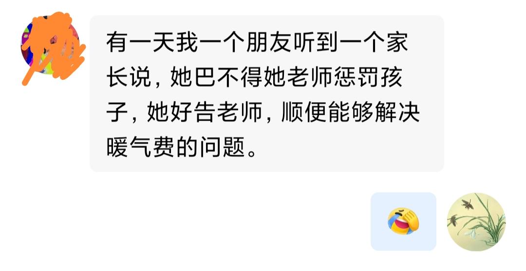 过了立冬,天一天比一天冷。天冷,心不能冷。 做教师就应该有一些理想化,这种理想化其实就是带着学生追求目标,不断激发学生,鼓励学生向着更好的目标前进。 但是学生毕竟是未成年人,他们身上有很多惰性,义务教育也具有强制性,有的事情是不能做的,犯了错就要批评、惩罚,当然学生也有个性,面对教师的批评惩罚,会做出应激的反应,这种应激的反应往往会让教师很恼火。 我经常告诉老师说,哪些事情是能做的,哪些事情是不能做的,哪些话是能说的,哪些话是不能说的,当怒火中烧时,一定要三思而后行。 说归说,真正能够做到的老师,或者心中能够坦然的接受这个观点的老师并不多。 那天有位年轻的老师说,老师批评学生,没有想到长得高大的学生恼羞成怒,一把老差点把她推倒了,并且破口大骂。她说长这么大,从来没有遇到这样的羞辱。 这位老师反问我,如果这件事情你遇到了,该怎么办? 我说如果你如果顺着学生的情绪来就错了,我们是专业人员,先控制好自己的情绪,当然也要保护好自己的安全。 我会默不作声,眼睛瞪着他看。 我也会在他情绪较稳定时,当着全班学生的面说,我教学这么多年,第一次遇到有人这样骂我。如果你不希望我管你,那么我可以和你的家长沟通,只要你家长同意,我以后就不用管你了,也不用为你操心了。 我有可能会让其他学生去请学校的相关领导来处理。 当矛盾激化到一定程度,要千方百计平息情绪。学生是发展中的个体,他们犯错很正常,但是作为专业化的我们不能犯错。 学生有这样的态度对待我,更应该思考的是,我和学生之间关系出现了问题。 如果你能做到这样,家校矛盾自然不会激化了。 教师 发一张图片,权当笑话,逗大家开心。