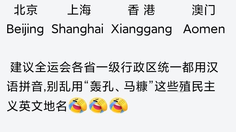 北京 上海 香 港 澳门 Beijing Shanghai Xianggang Aomen 建议全运会各省一级行政区统一都用汉语拼音,别乱用“轰孔、马糠”这些殖民主义英文地名[捂脸][捂脸][捂脸]