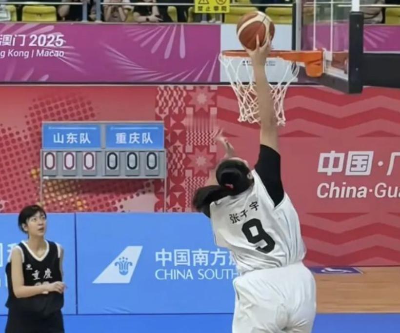 真的太厉害了!中国女篮赛场上,第一个扣篮的女运动员,终于是诞生了…… 2025年全运会女篮比赛,迎来了一次女篮历史性时刻,那就是在女篮U18小组赛上,2米26的18岁小将张子宇,完成了一次扣篮,这也是本届全运会上,第一次女篮运动员完成一次扣篮,当然了,这也是中国女篮历史上,第一次在正式比赛完成扣篮的女运动员。毫无疑问,张子宇创造了一次女篮历史的先河。 在山东队和重庆队的比赛当中,姚子萱给张子宇传了一次非常舒服的球,篮下拿到球之后,张子宇跳了起来,单手完成了一次扣篮,就这样,中国女篮运动员第一次扣篮就诞生了…… 其实,张子宇在训练的时候,就完成过很多扣篮,但是,由于她身高2米26,体身达到了300斤,因上,教练要求她在比赛中,不能够跳,只要站着打球就可以了,毕竟,就算是不跳起来,也没有人有她高,完全可以轻松投篮,然而,这一次,张子宇没有听教练的,她跳了起来,足足跳了30公分高,轻松完成了一次扣篮…… 本场比赛,张子宇虽然只打了11分钟,但是,她却9中9,投篮命中率达到了百分之百,砍下了18分,依然是场上最亮眼的明星! 由于2米26张子宇的存在,可以说,全运会U18女篮比赛,也是早早就失去了悬念,毕竟,张子宇站在篮下,对方想要得分很困难,反观,张子宇想要得分都是十分容易,只要篮下一站,队友将球传到她的手上,就可以轻松得分。 因此,全运会U18女篮冠军,几乎就是山东女篮的囊中之物了!