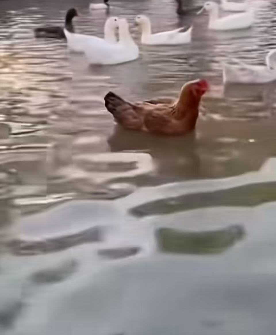 可让主人万万没想到的是,这母鸡下水之后,居然稳稳地浮在水面上,还像鸭子一样慢悠悠地游动起来。