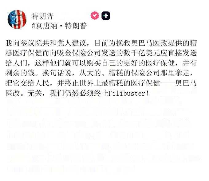 特朗普呼吁对医保进行重大改革:将数千亿的资金直接拨给人民,而不是拨给保险公司! 2025年11月8日,特朗普发帖强烈呼吁参议院共和党人彻底改革奥巴马医改的补贴机制。他直指目前每年数百亿美元的资金正流向“吸血的保险公司”,用来维持这个“世界上最差的医保系统”,并提议将这些钱直接发给美国人民,让民众自己购买“更好、更便宜”的医保,还能剩下钱! 这不是空谈,而是直接回应当前美国政府关门危机!民主党坚持在重开政府的同时延长医保补贴,共和党坚持先重开政府再谈医保。 特朗普这帖子一出,立刻点燃辩论——他想绕过保险公司,把钱放进民众口袋,可能通过HSA(健康储蓄账户)或直接现金形式,让人民自由选择。 特朗普这波操作,经典“排水沟”风格:不修系统,直接把水抽干给人民! 不管特朗普这招成败如何,都会是2026中期选举最大炸弹。