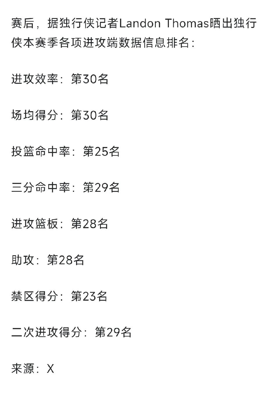 哈哈,防守赢得总冠军!尼克被彻底笑死了。媒体人Bobby Karalla给出的数据,独行侠目前的相对进攻效率值创下了NBA历史最差纪录。 虽然独行侠抽中状元签后,外界对尼克的风评好了很多,但是本赛季开打,弗拉格的成长速度远没有大家想象中的好,而且独行侠的战绩也非常差。 除非弗拉格带队夺冠,要不然这笔交易将永远钉在历史耻辱上的。