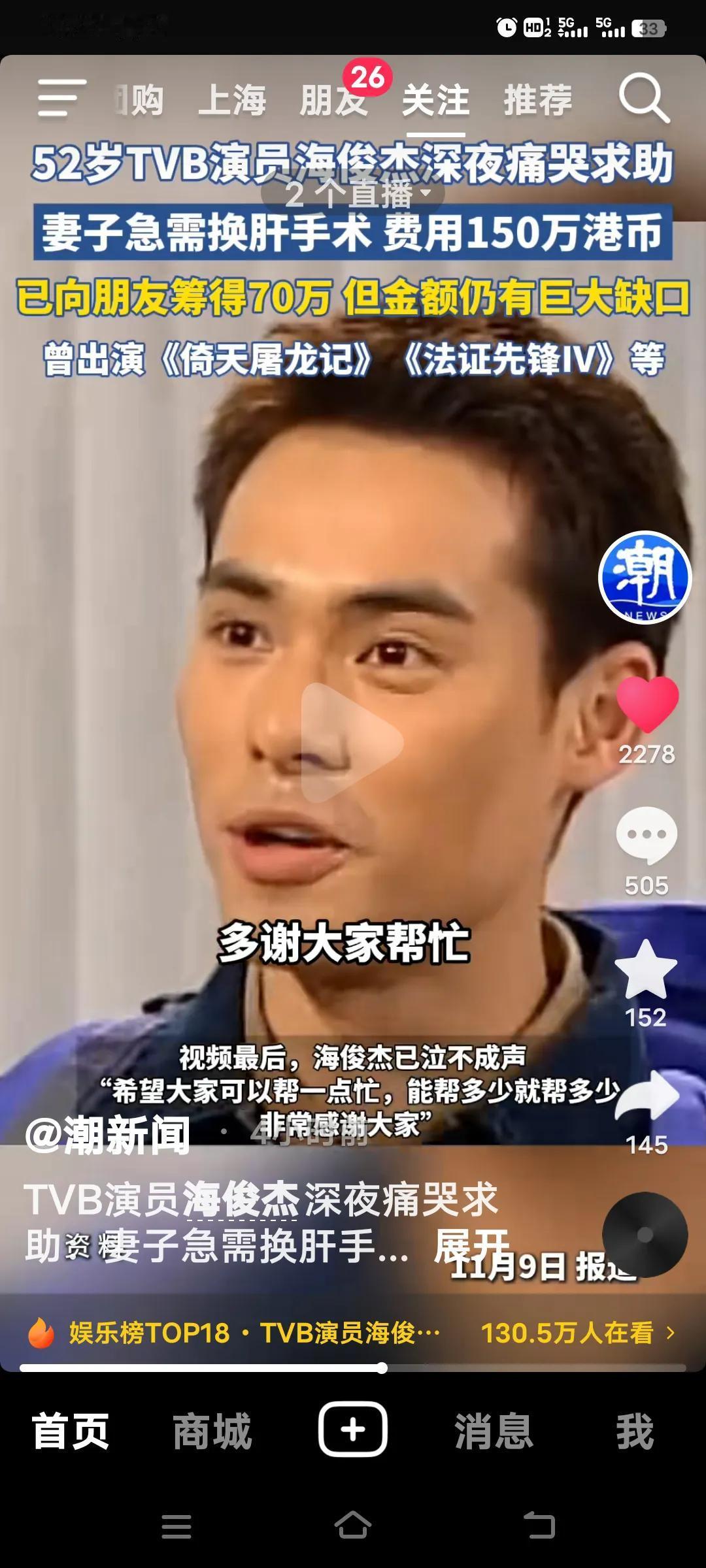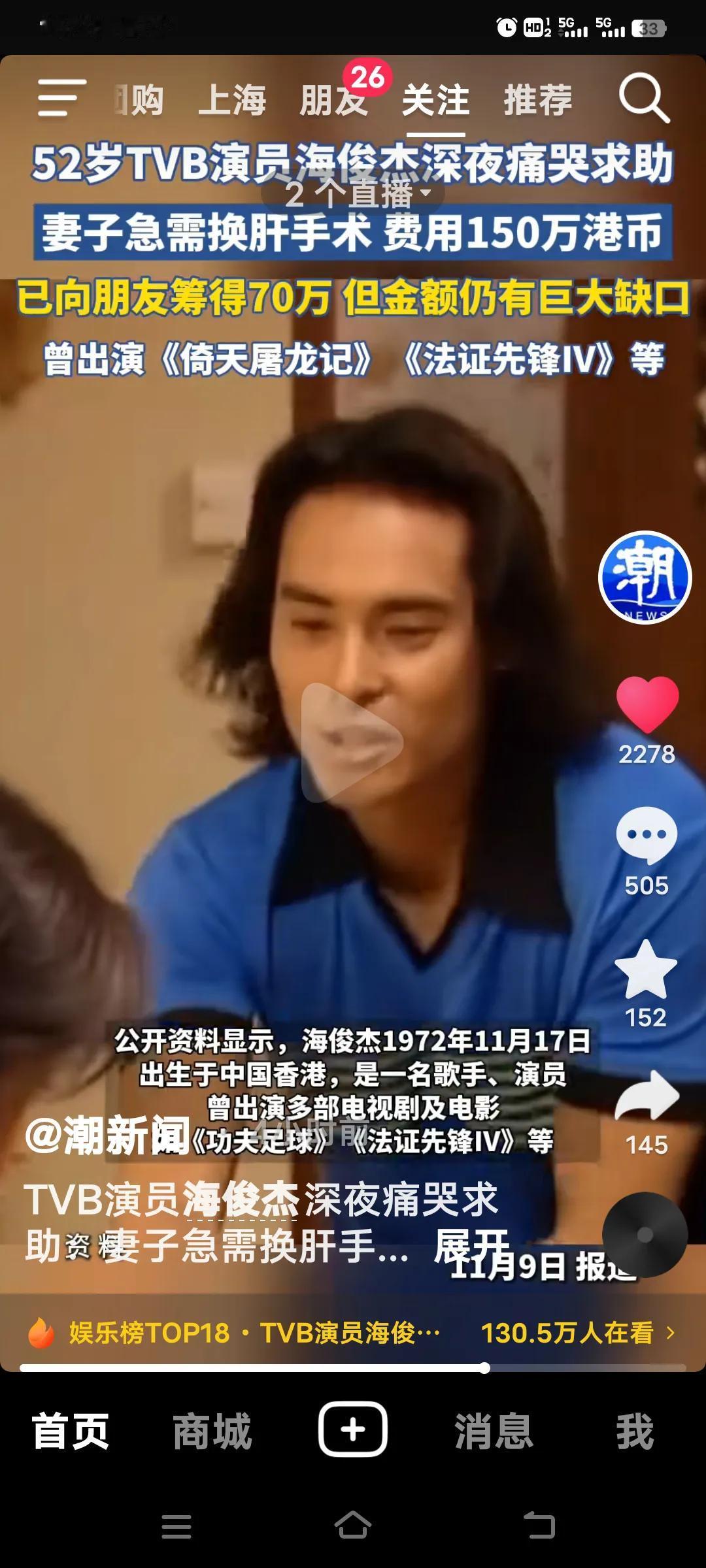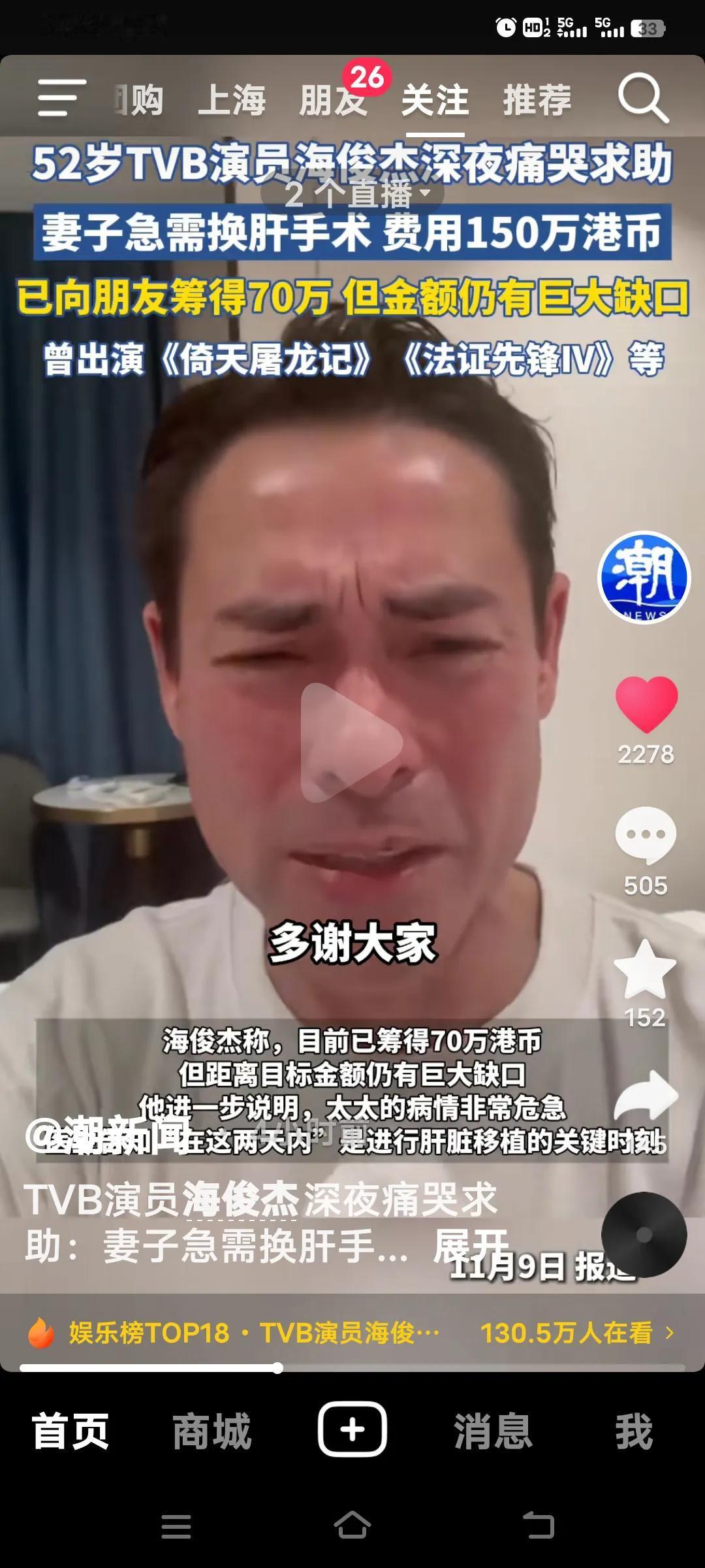 11月8日晚,TVB演员海俊杰于社交平台发布视频,为患急性肝硬化的太太寻求救助。他情绪异常激动,几度痛哭流涕,称手术费用需150万港币,目前仅筹集到70万,资金缺口极大。 医生已明确告知,这两天是肝脏移植的关键时期。为证明求助信息真实可靠,他特意提及当晚10点这一具体时间。 他的好友陈晓东证实了该消息,还前往广州探望,并送上了慰问金。这不禁让人联想到TVB演员艾威,其妻子也曾急需进行换肝手术。在生命面前,时间分秒必争,希望大家能够伸出援手,帮助海俊杰的太太渡过难关。 听闻这位演员此前也曾救助他人,如今他遭遇困境,正是彰显真情的时刻。演艺圈的同行们若能齐心协力,或许能够凑齐这笔费用。待他妻子康复,顺利度过难关,他便能继续正常工作赚钱。 海俊杰演技 侯俊杰医生