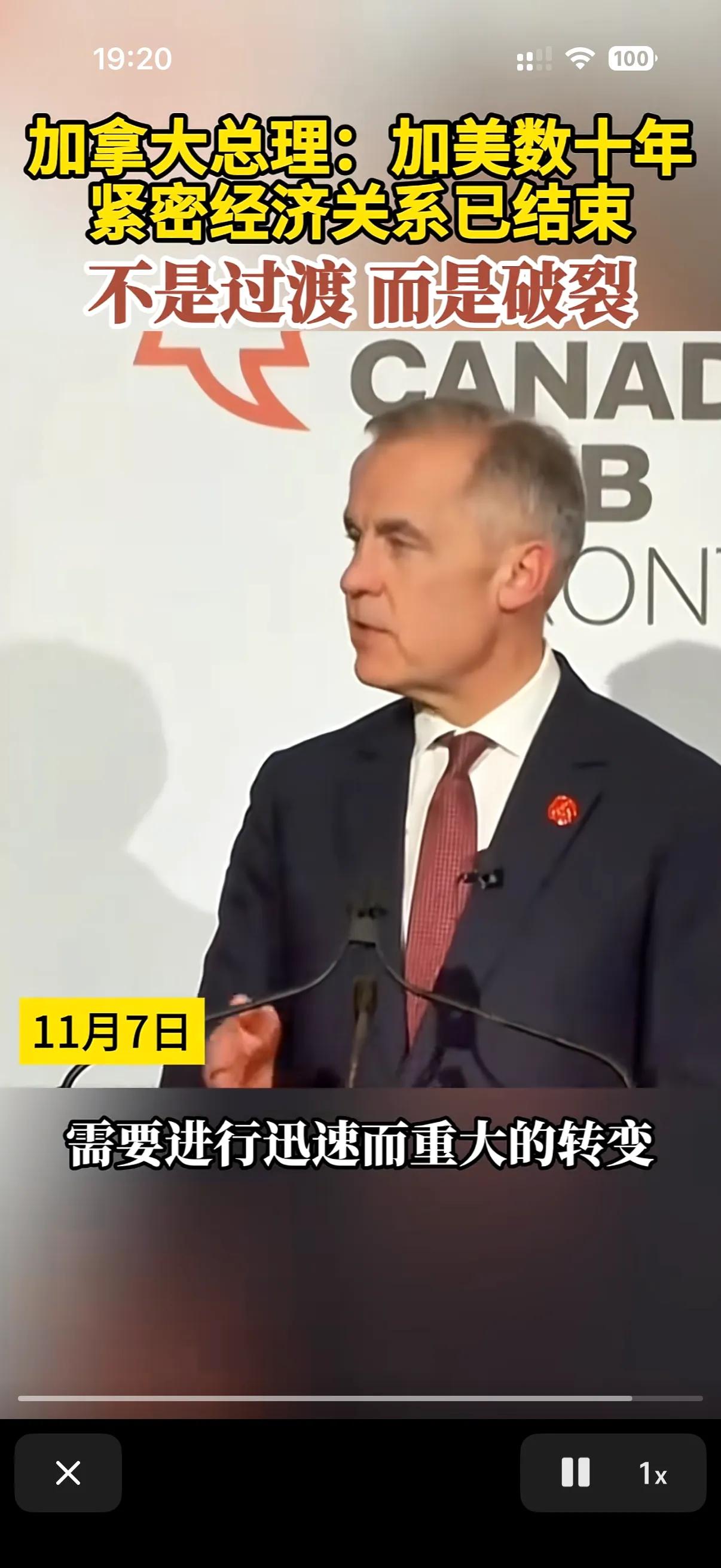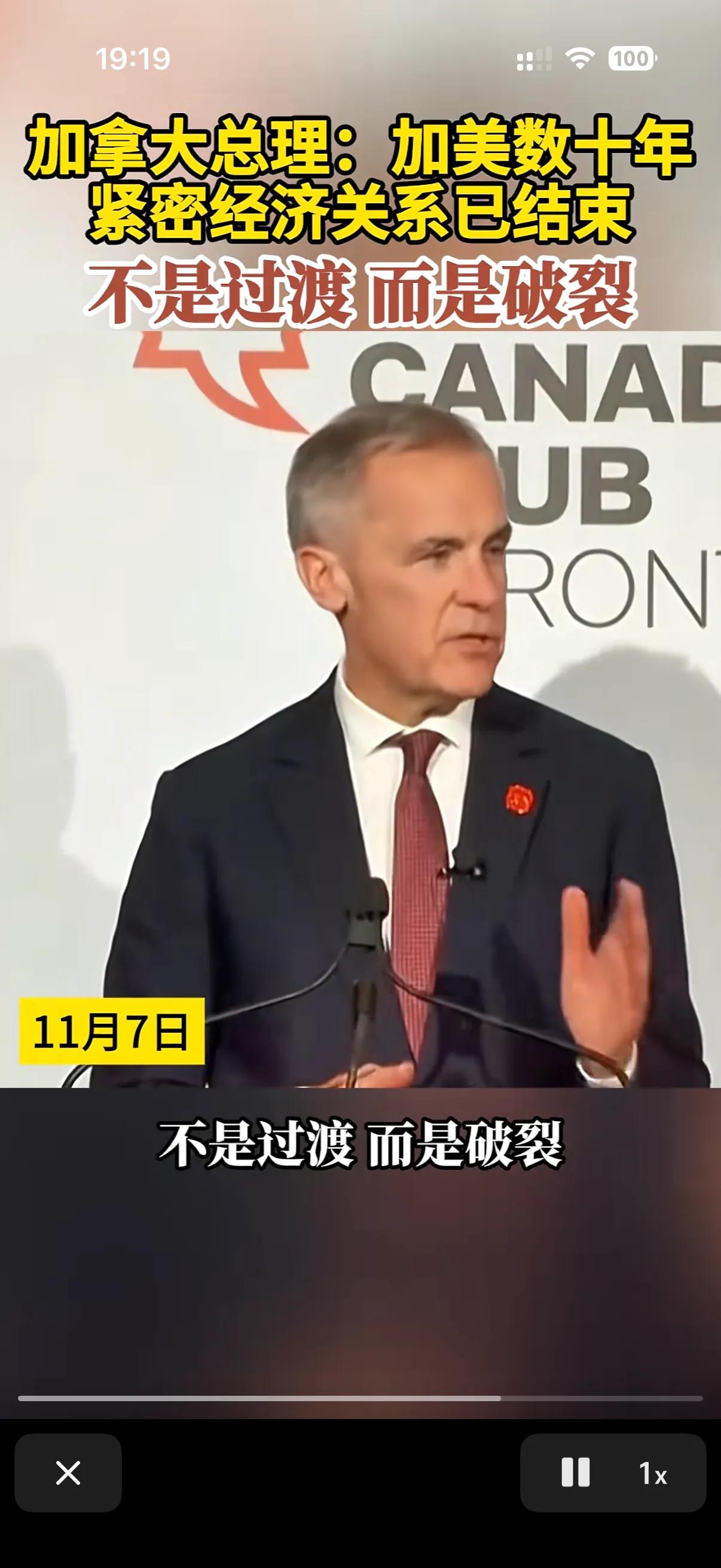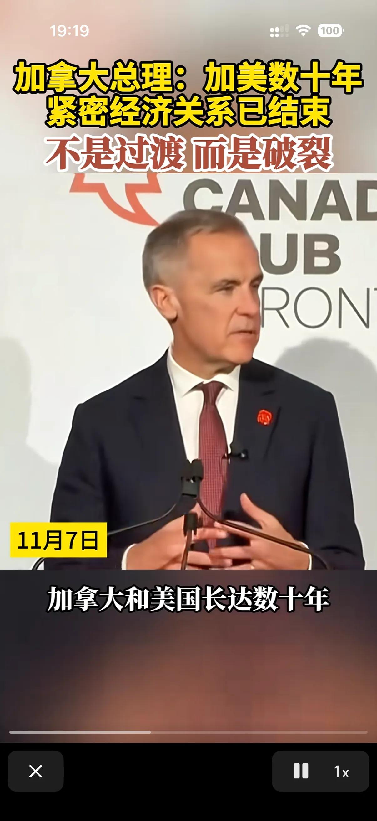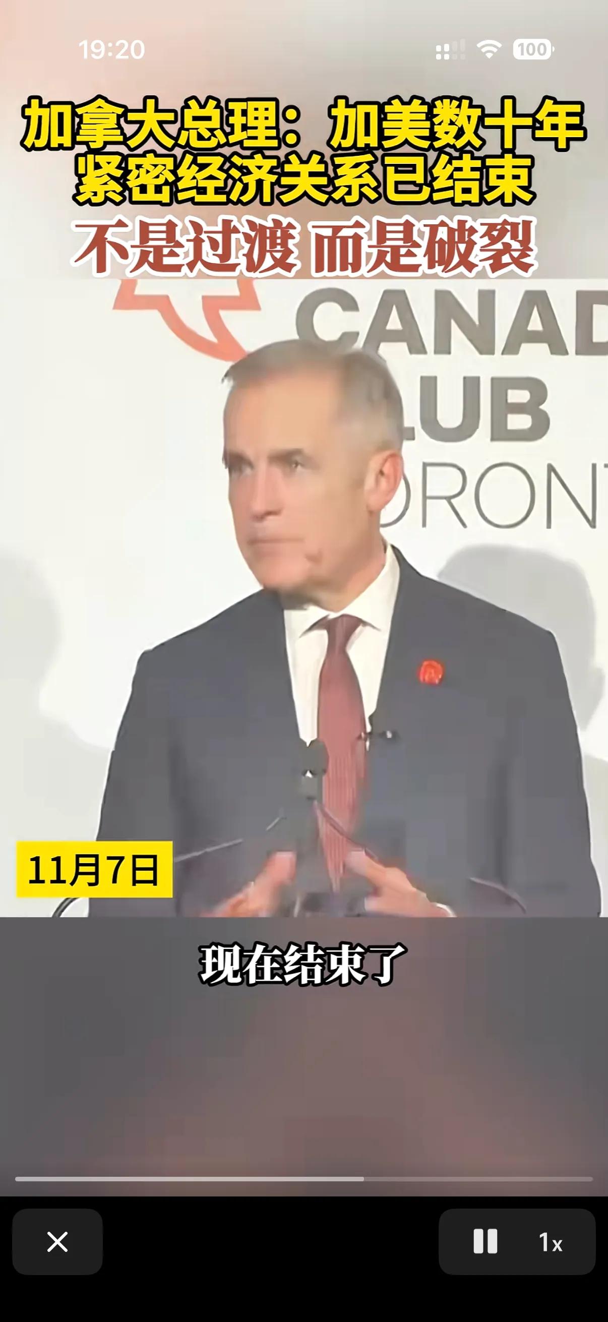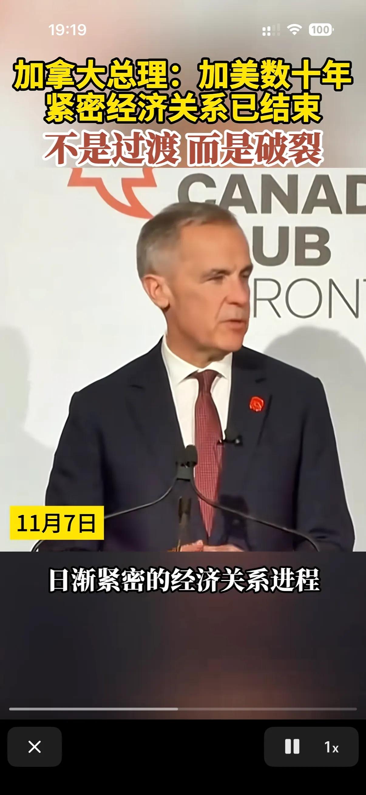 加拿大彻底和美国闹崩了! 11.7号加拿大总理发表讲话称,从此以后加拿大和美国紧密经济关系彻底结束了! 不是中间过渡关系,是彻底破裂! 因为啥呢,曾经的友好战略伙伴关系,现如今却要分道扬镳呢! 这就要从特朗普上台之后的一顿骚操作了! 特朗普上台之后,就是想吞并加拿大,就是想把加拿大变成美国的一个州! 在实施计划不成后,就疯狂的给加拿大加关税! 相信加拿大任何一个总理都不会答应让加拿大成为美国的一个州就是了!