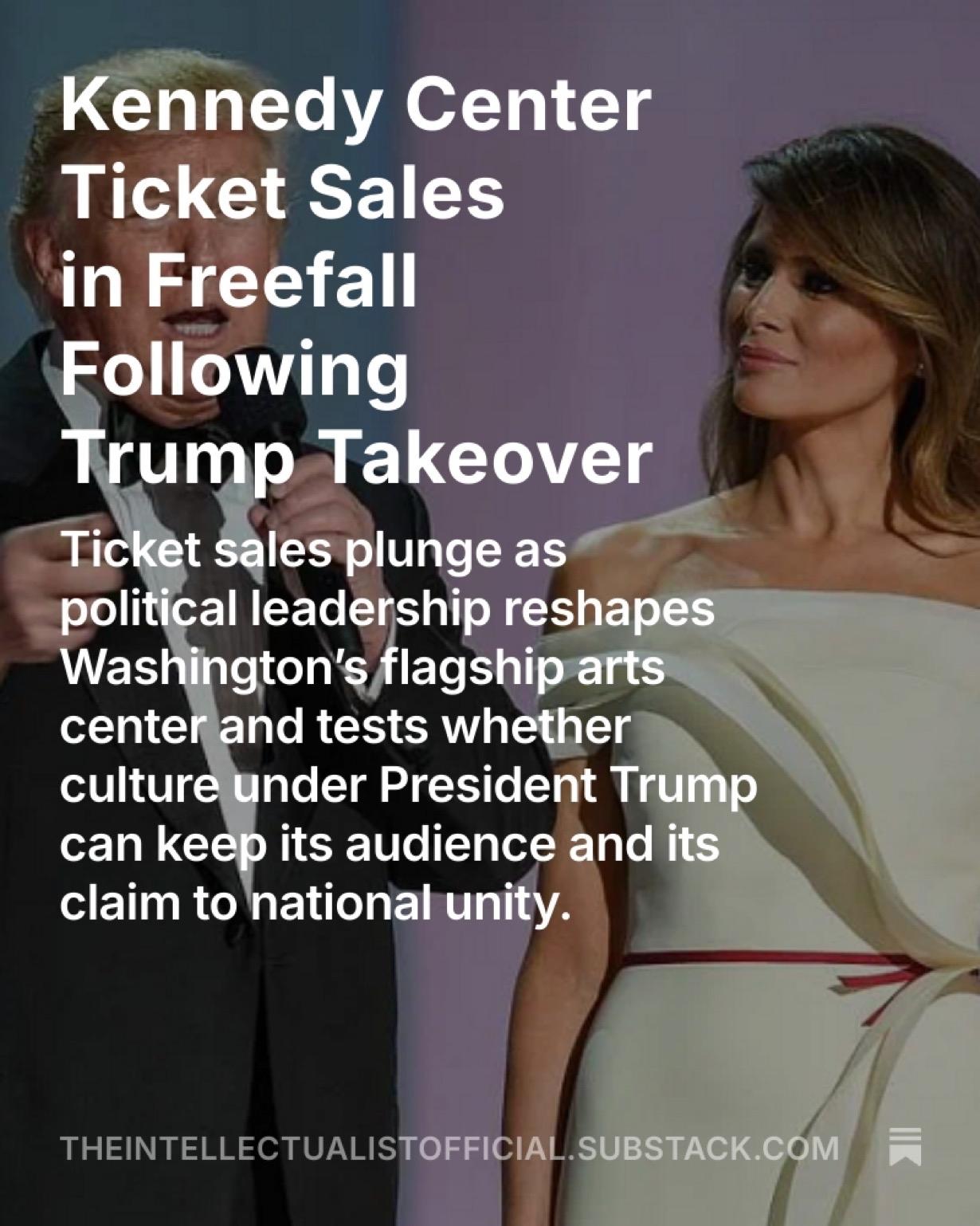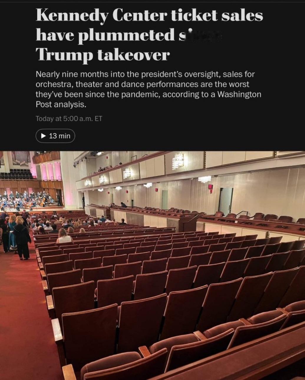 自特朗普二月份任命自己为肯尼迪中心主席以来,观众人数持续下滑。《纽约时报》报道称,门票销售额比去年下降了约50%。空座位、裁员和艺术家抵制反映出出席率和参与度的下降。