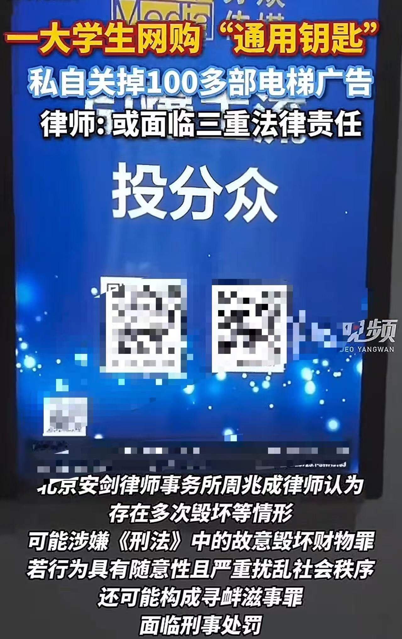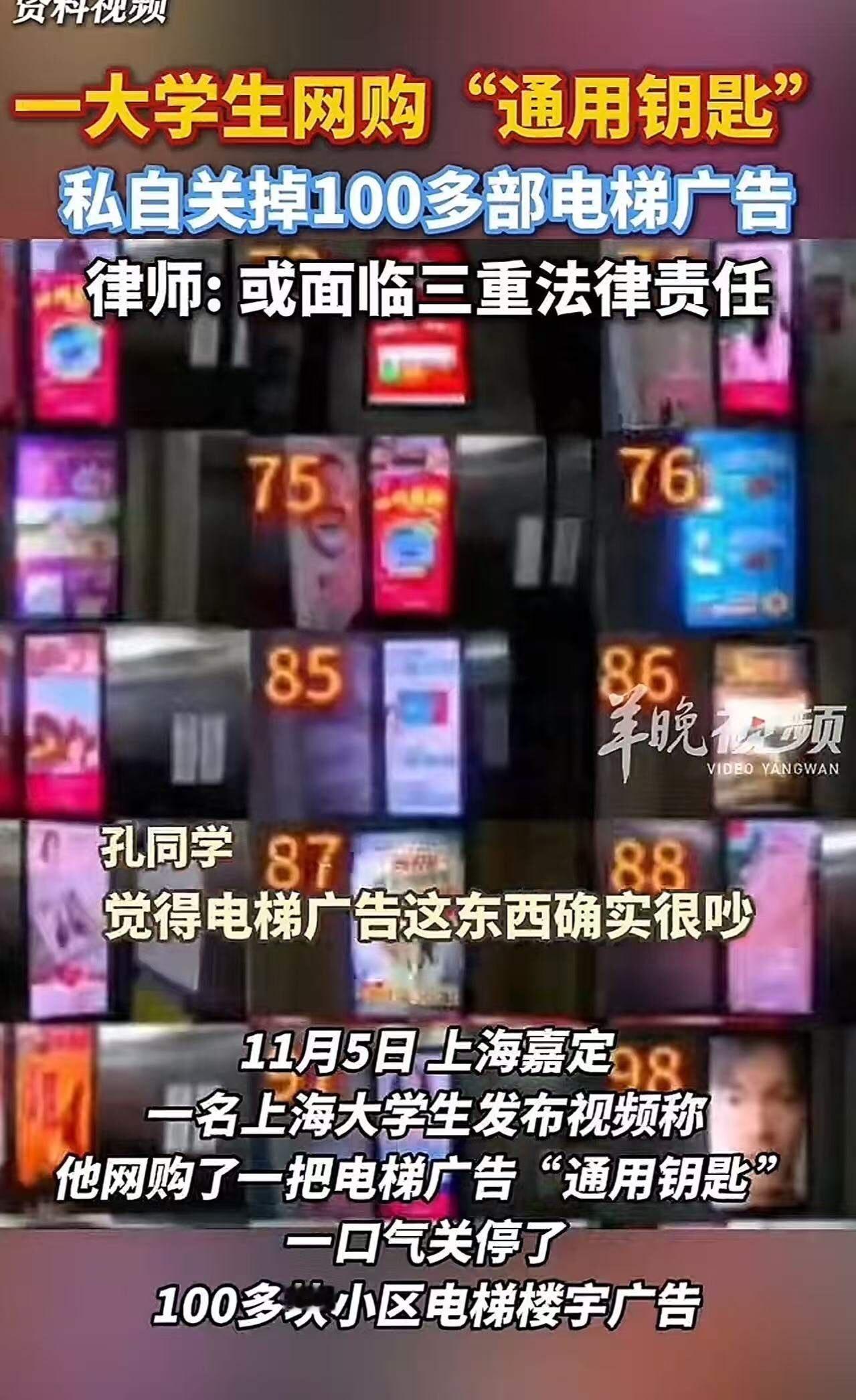 “这是正义之举,还是违法犯罪?”上海嘉定,一名大学生网购了一把电梯广告通用钥匙,一口气关停了100多块小区电梯广告!大学生:“电梯广告属于一种入侵式广告。这声音很吵,大家对此也十分不满,我是做好事!” 这段话看似简单,却引发了无数的争议和思考:一个年轻人的“善意”行为,究竟是维护了公共环境,还是触碰了法律的底线?这背后,藏着我们这个时代的困境,也折射出一场关于“正义”与“自由”的激烈辩论。 你是否曾在小区里被那刺耳的广告声扰得心烦意乱?是不是也曾想过,为什么这些广告可以肆无忌惮地占据电梯空间?这名大学生的行为,或许只是出于“好心”,但他用行动告诉我们:在这个信息爆炸、广告泛滥的时代,普通人到底有多大的话语权?他的“关停”,似乎是一种宣言——我们不需要这种“打扰”的广告,我们渴望一个安静、纯粹的生活空间。 然而,问题的另一面也随之浮出水面。用技术手段“关停”广告,是否意味着侵犯了他人的财产权?是不是在法律的灰色地带里,打了个擦边球?这位大学生说自己是“做好事”,但有人会站出来质疑:我们是不是可以用“善意”来掩盖一切?是否每个人都可以成为“正义的裁判”,用自己的标准去定义“合法”和“道德”? 这正引发了一个更深层次的问题:在我们的社会中,个人的“善意”如何与公共利益相平衡?当个人行动触碰到法律的边界时,我们又该如何看待?是宽容与理解,还是坚守法律的底线?这场看似“善意”的行动,实际上折射出的是我们每个人内心的矛盾:是迎合了“我觉得对”的直觉,还是在无形中挑战了“法律”的尺度? 更令人深思的是,这名大学生的“善意”行为,是否也在无意中激发了更多的反思?许多年轻人都在问:我们可以用什么方式表达自己的不满?怎样才能在维护公共空间的同时,又不触碰法律的底线?这不仅仅是一个个案,而是一面镜子,映照出我们整个时代的价值观变迁。 或许,真正的“正义”不在一时的冲动,而在于用理性和法律的尺度去守护每个人的权益。我们都希望生活在一个更美好的环境里,但这个愿望,不能成为打破法律规则的借口。正如那位年轻人所说:“我只是做好事。”但这背后,或许更需要我们每个人的反思——在追求“善”的过程中,我们是否也要学会尊重规则、尊重他人? 这场“关停广告”的行动,究竟是“正义之举”还是“违法犯罪”?答案或许没有那么简单。但可以确定的是,它激起了我们每个人心中那份关于“正义”“自由”“责任”的深刻思考。我们都在寻找一个平衡点:既能表达自己的声音,又不越界伤害他人。也许,真正的勇气,是在坚持正义的同时,懂得用理性去守护这份美好。电梯口广告 无电梯电梯广告 智能锁广告投放