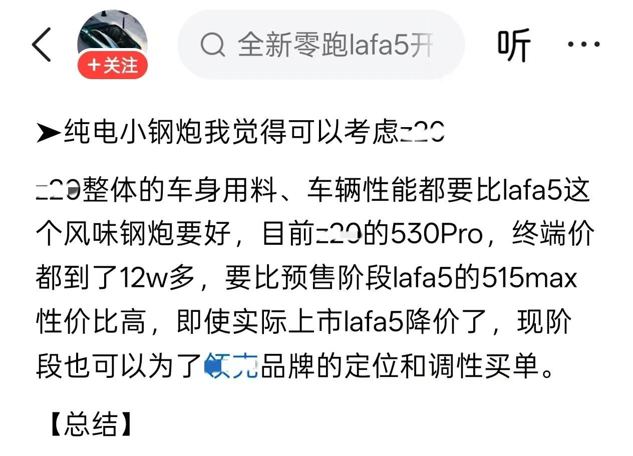 家人们!谁还在为高尔夫GTI的价格emo啊?零跑Lafa5直接把“电动高尔夫”的快乐拉满,简直是年轻人的梦中情车! 它跟高尔夫GTI一样带运动范儿,但开起来更对味儿!无边框车门+19英寸运动轮毂,轿跑造型出街比GTI还吸睛;中欧联合调的底盘,过弯稳得像贴地飞,后置后驱+弹射起步,推背感一点不输燃油钢炮。 最绝的是智能和舒适感,双AI大模型语音超懂梗,“零甲醛”健康座舱坐着放心,全景天幕白天看云夜晚观星。对比高尔夫GTI这21万+的价格,Lafa5这10.58万起的预售价,直接把年轻运动梦变得触手可及啦!