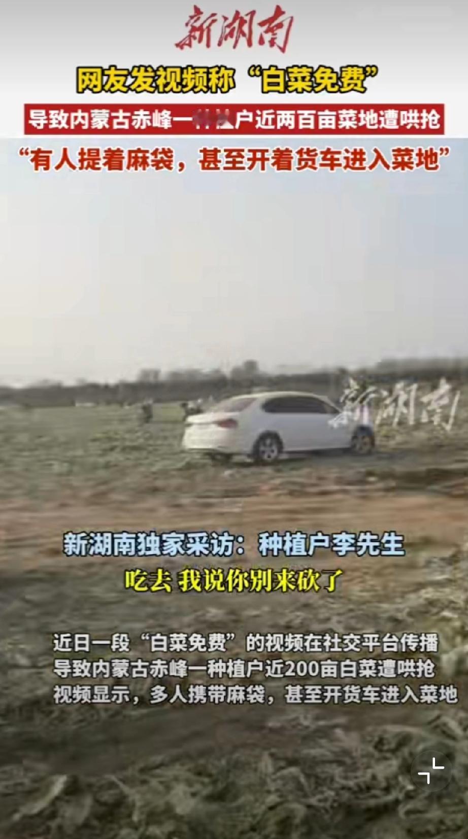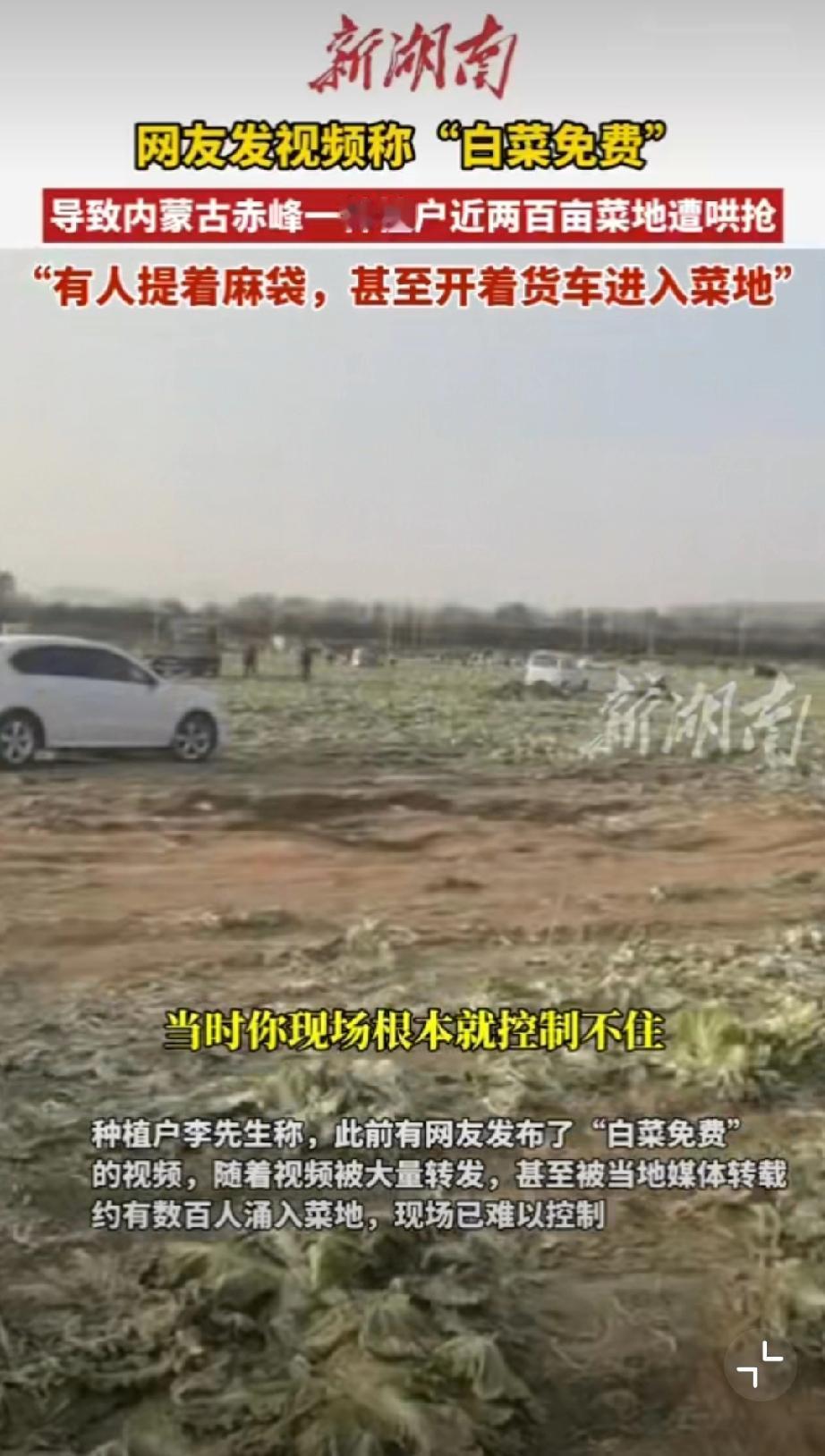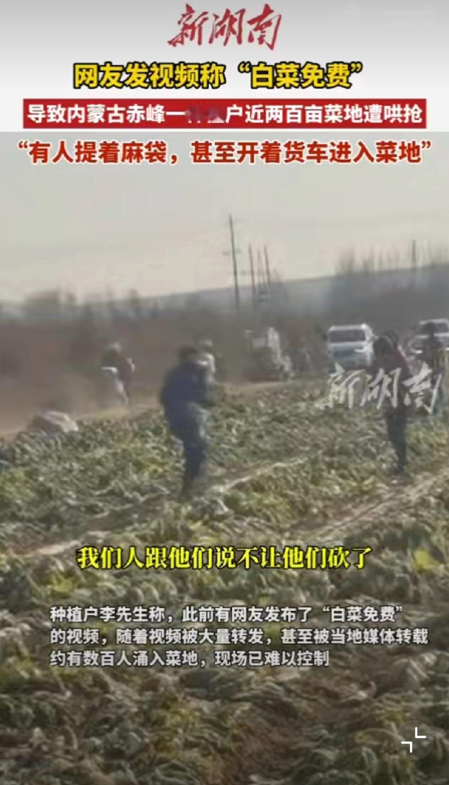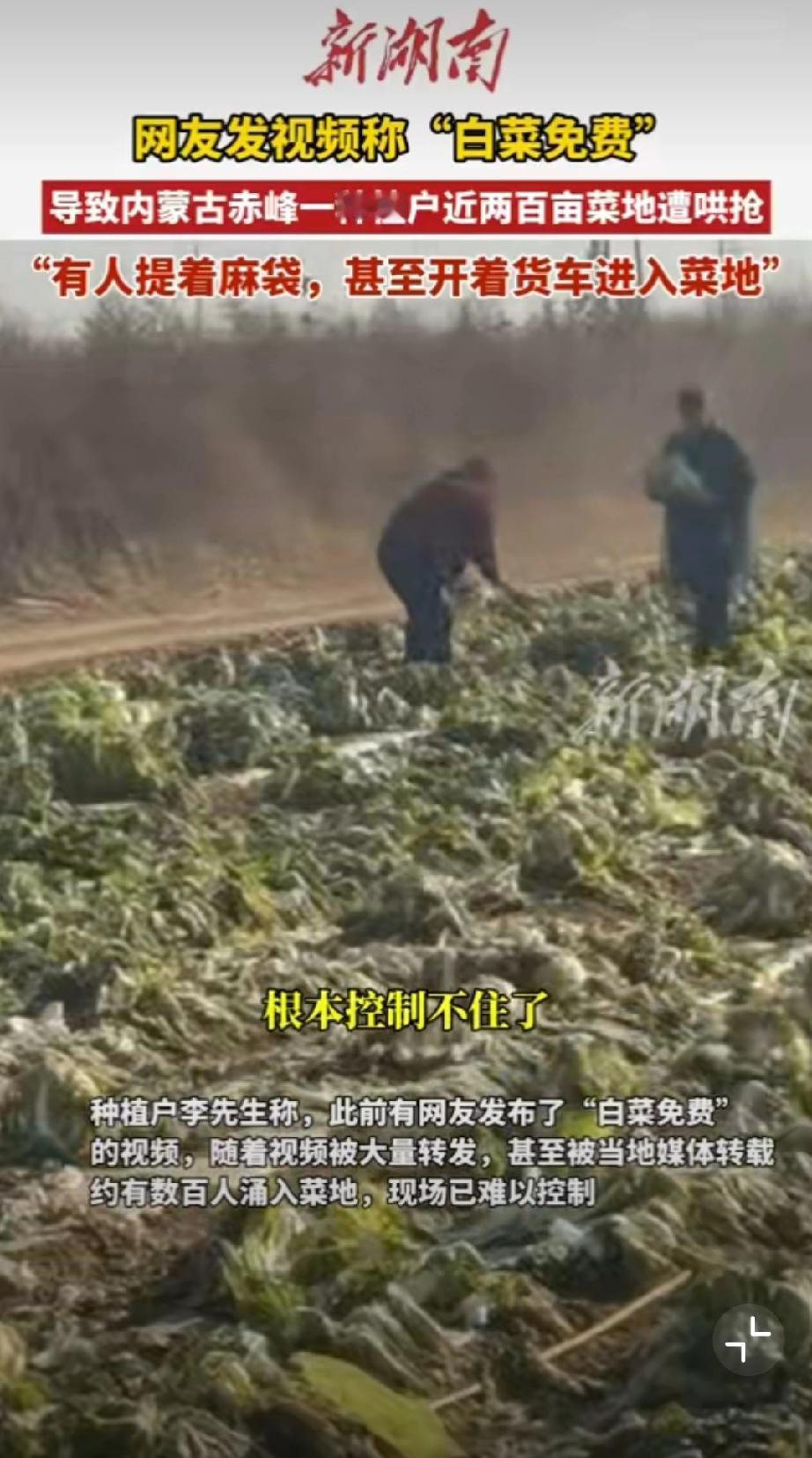 数百人涌入200亩白菜遭抢。造谣种植户的农产品“免费收割”,套路已经开始固化:造谣、起哄,然后趁乱谋私,一定要警惕这类不正之风。 先由个别网友造谣,然后在网络或村子里扩散传播,由于参与人数众多,几十人甚至数百人参与,最终形成法不责众的局面。但对种植户造成沉重的经济损失。 真正追责的也仅限于造谣者和部分典型参与人员,多数人得以“零元购”逍遥法外,尝到“甜头”的人容易乐此不彼,以后只会变本加厉。 这种群体行为模式,与网络暴力有相似之处,尽管每个人都直接参与并造成了一定损失,但却难以对所有人一一追责。种植白菜 菜贱伤菜农 农户大白菜