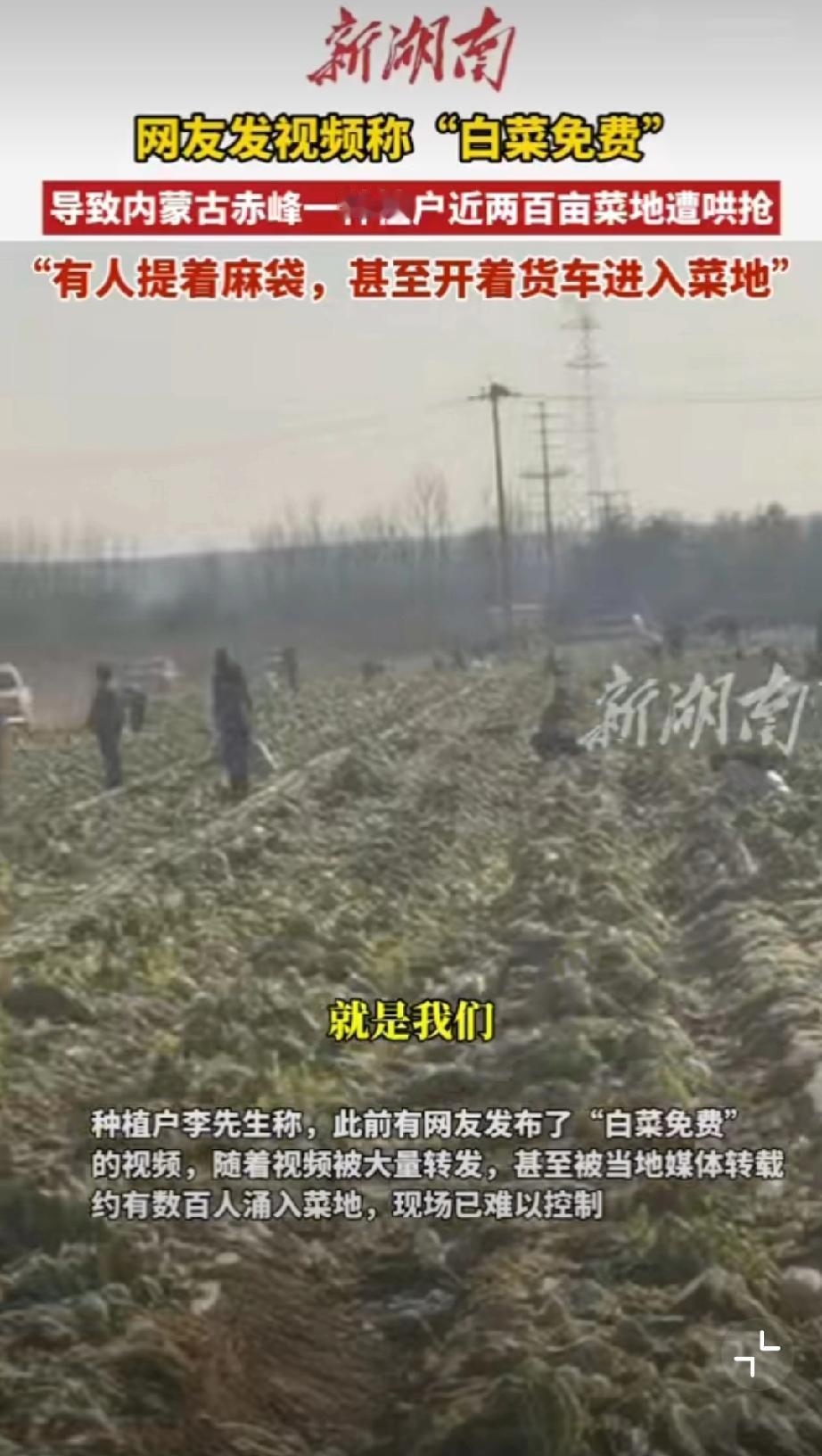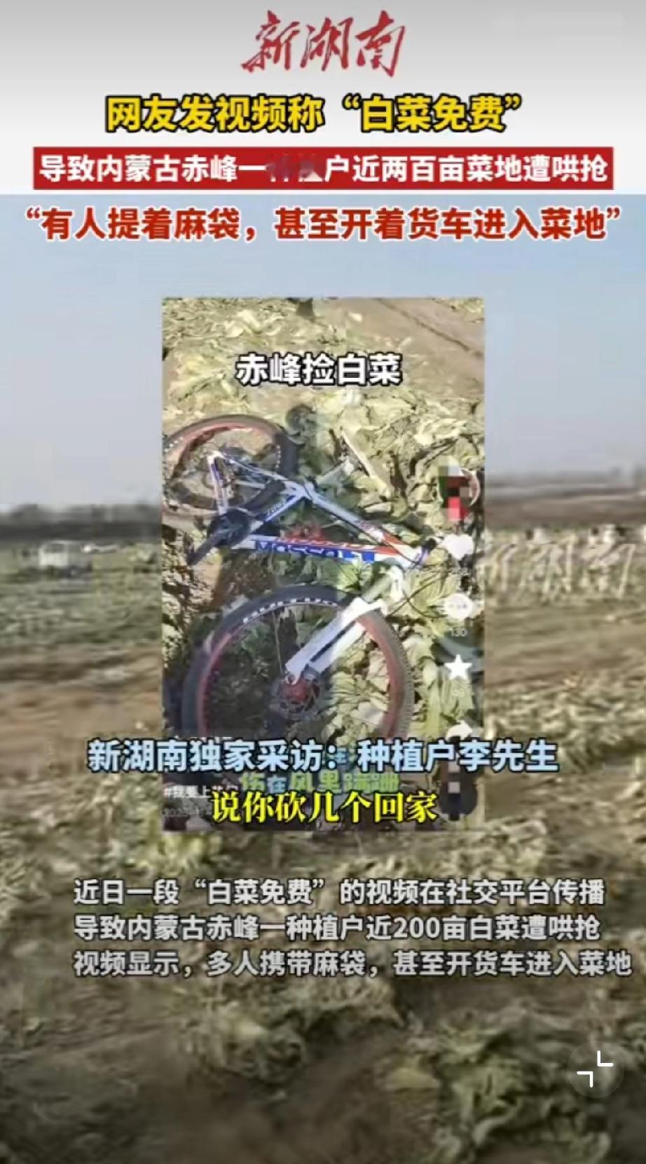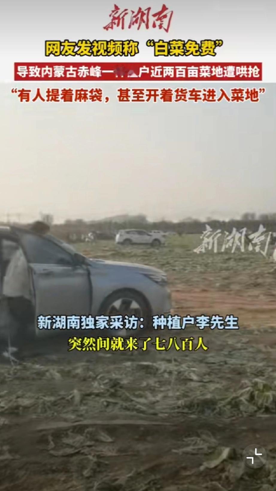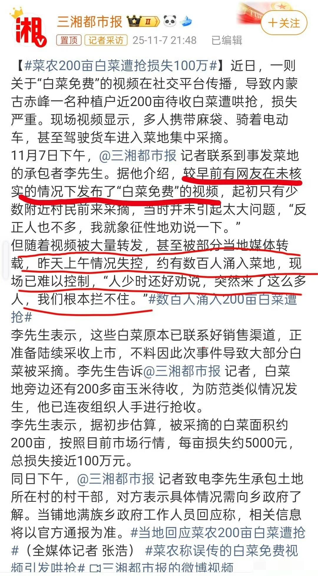 数百人涌入200亩白菜遭抢。造谣种植户的农产品“免费收割”,套路已经开始固化:造谣、起哄,然后趁乱谋私,一定要警惕这类不正之风。 先由个别网友造谣,然后在网络或村子里扩散传播,由于参与人数众多,几十人甚至数百人参与,最终形成法不责众的局面。但对种植户造成沉重的经济损失。 真正追责的也仅限于造谣者和部分典型参与人员,多数人得以“零元购”逍遥法外,尝到“甜头”的人容易乐此不彼,以后只会变本加厉。 这种群体行为模式,与网络暴力有相似之处,尽管每个人都直接参与并造成了一定损失,但却难以对所有人一一追责。种植白菜 菜贱伤菜农 农户大白菜