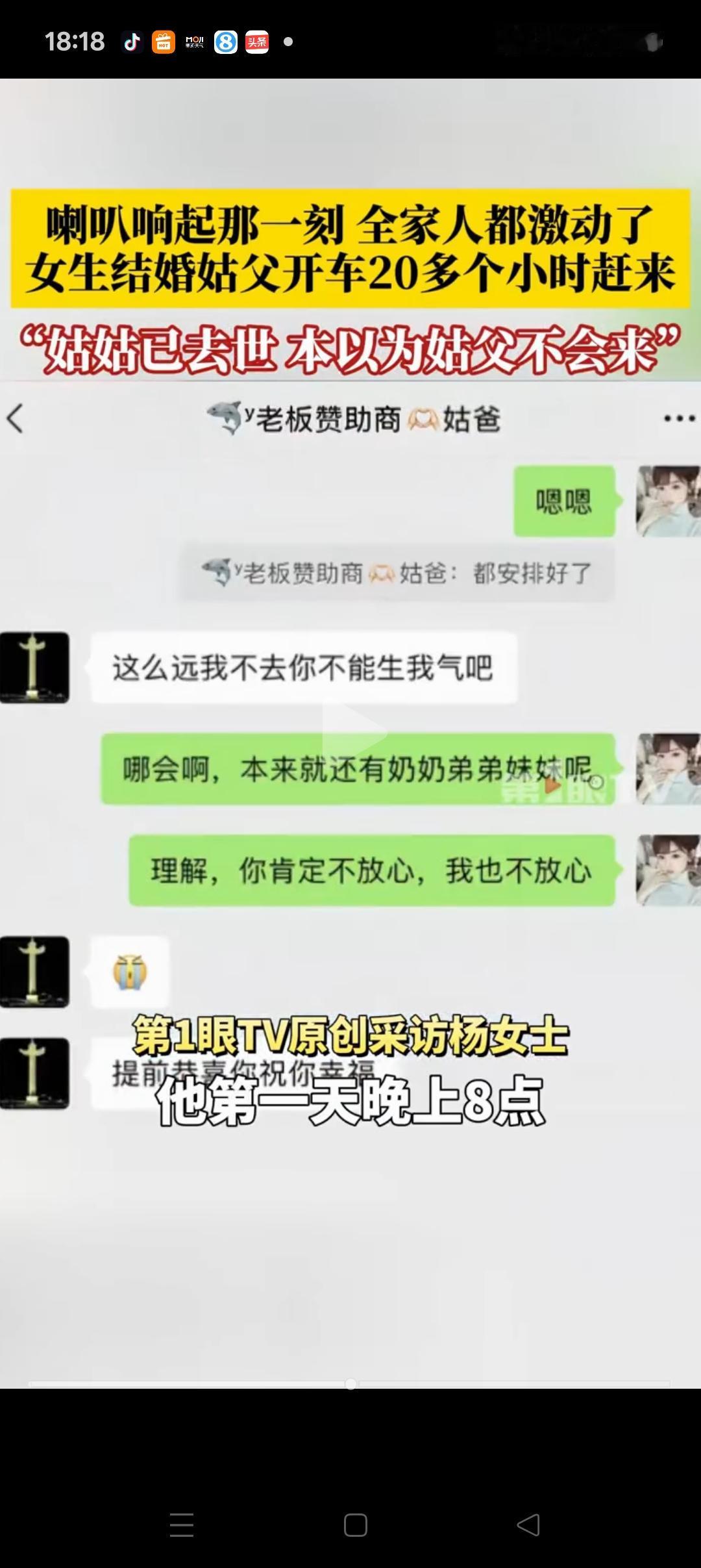 “泪目了”,河南,女生准备结婚,提前通知姑父,但因为姑姑去世了,家里还有弟弟,妹妹需要照顾,姑父说可能到时候去不了。 没想到,姑父当天还是回来了,开了20多小时的车,到家门口时还按了一声喇叭。侄女一家开心极了,纷纷上去欢迎,并献上拥抱。 这姑父真的不错,想必生前也是很爱姑姑的。相信他回来的这一路上,脑海里浮现的都是和姑姑的过往,幸福。。 评论区里很多人评论舅舅,姑父到底谁更亲!其实有一些不妥,毕竟每个人对待感情是不一样的,我就是和舅舅要更亲近一些,相信每个人也都有所不同。 这或许就是亲情的意义,虽然远在天边,但只要有事情需要帮忙,心永远都在一起[玫瑰][玫瑰]