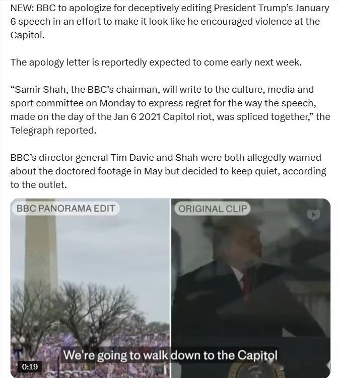 BBC将就其“误导性剪辑”特朗普总统1月6日演讲一事公开道歉,因为该剪辑被认为故意让演讲看起来像是在煽动国会山的暴力事件。 据报道,这封道歉信预计将在下周初发布。 《每日电讯报》报道称:“BBC主席萨米尔·沙阿将于周一致信文化、媒体和体育委员会,对BBC在剪辑2021年1月6日国会骚乱当天特朗普演讲时的处理方式表示遗憾。” 据该报透露,BBC总干事蒂姆·戴维和沙阿早在今年5月就被警告这段视频是经过篡改的,但两人当时选择保持沉默。