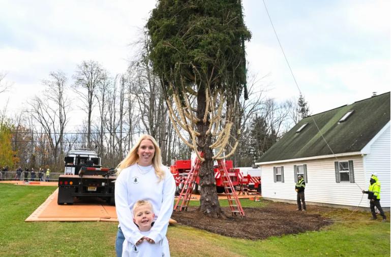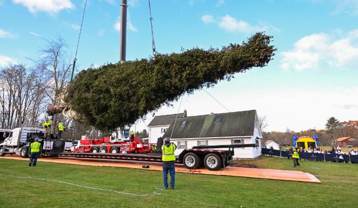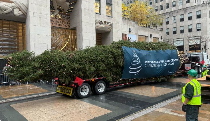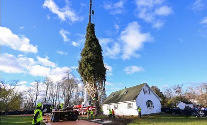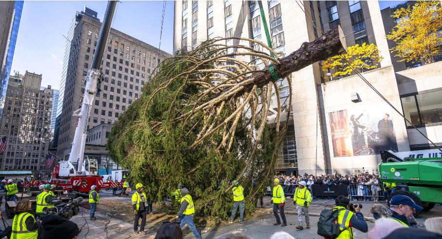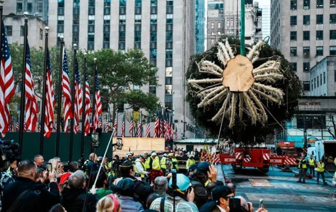 这棵树的到来,意味着圣诞节也快来临 一如往常,著名的洛克菲勒中心圣诞树,从纽约州北部被运抵纽约曼哈顿中城洛克菲勒中心,整个行程约240公里。工人们花了几个小时,在一台起重机的帮助下才把这棵巨树竖起来,放在了俯瞰广场的标志性位置。 此前两天,工人们在东格林布什的一个农场,将这棵约22米高、11吨重的挪威云杉砍倒并包裹起来,吊到一辆平板卡车上,作为今年洛克菲勒中心的圣诞树。 按传统,在12月3日正式点亮圣诞树之前,这棵树将装饰超过5万盏灯,顶部装饰一颗施华洛世奇水晶星。而这棵树将一直展出到明年1月中旬,最后将被磨成木材,捐给慈善组织,最终的处置,也算得上物尽其用。