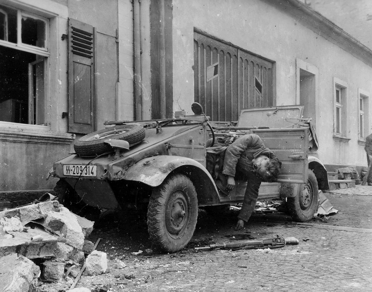 可怜,坚持到了现在——1945年3月22日,圣文德尔市。德军一辆大众82型桶车在街头停着,驾驶员就阵亡在车里。 大众82型桶车(参见图2~3)是德国大众公司基于甲壳虫底盘研制的军用越野车,配备985毫升风冷发动机,全重725公斤,二战期间德军共生产50435辆。 圣文德尔市是德国萨尔州战略交通枢纽,1945年3月美军第70步兵师在此突破“西壁防线”最后段。