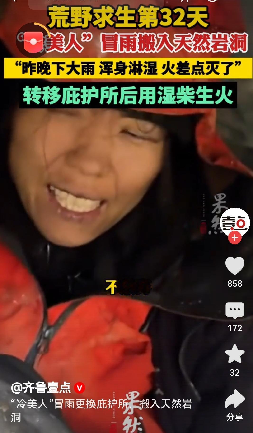 荒野求生“冷美人”冒雨搬入天然岩洞“冷美人”太飒了!暴雨里转移庇护所、湿柴生火,生理期也不垮,荒野里的韧劲又美又强,这股不放弃的劲儿看得人又燃又佩服![赞][赞][赞] 荒野求生女选手 评论打卡任务