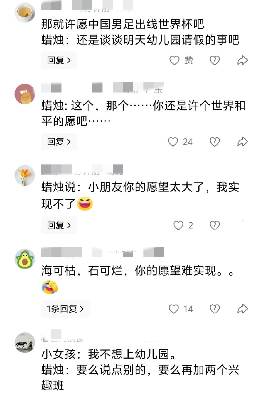 这个小女孩火上了新华社 她过两岁生日许的愿,是我不想上幼儿园,然后就开始吹蜡烛,连着吹了三次这蜡烛都没吹灭。 网友们调侃 蜡烛:小朋友你的愿望太大了,我实现不了。 海可枯,石可烂。你的愿望难实现 蜡烛:要么说点别的,要么再加两个兴趣班 小女孩太可爱了,蜡烛吹不灭,这个生日愿望难实现啊!