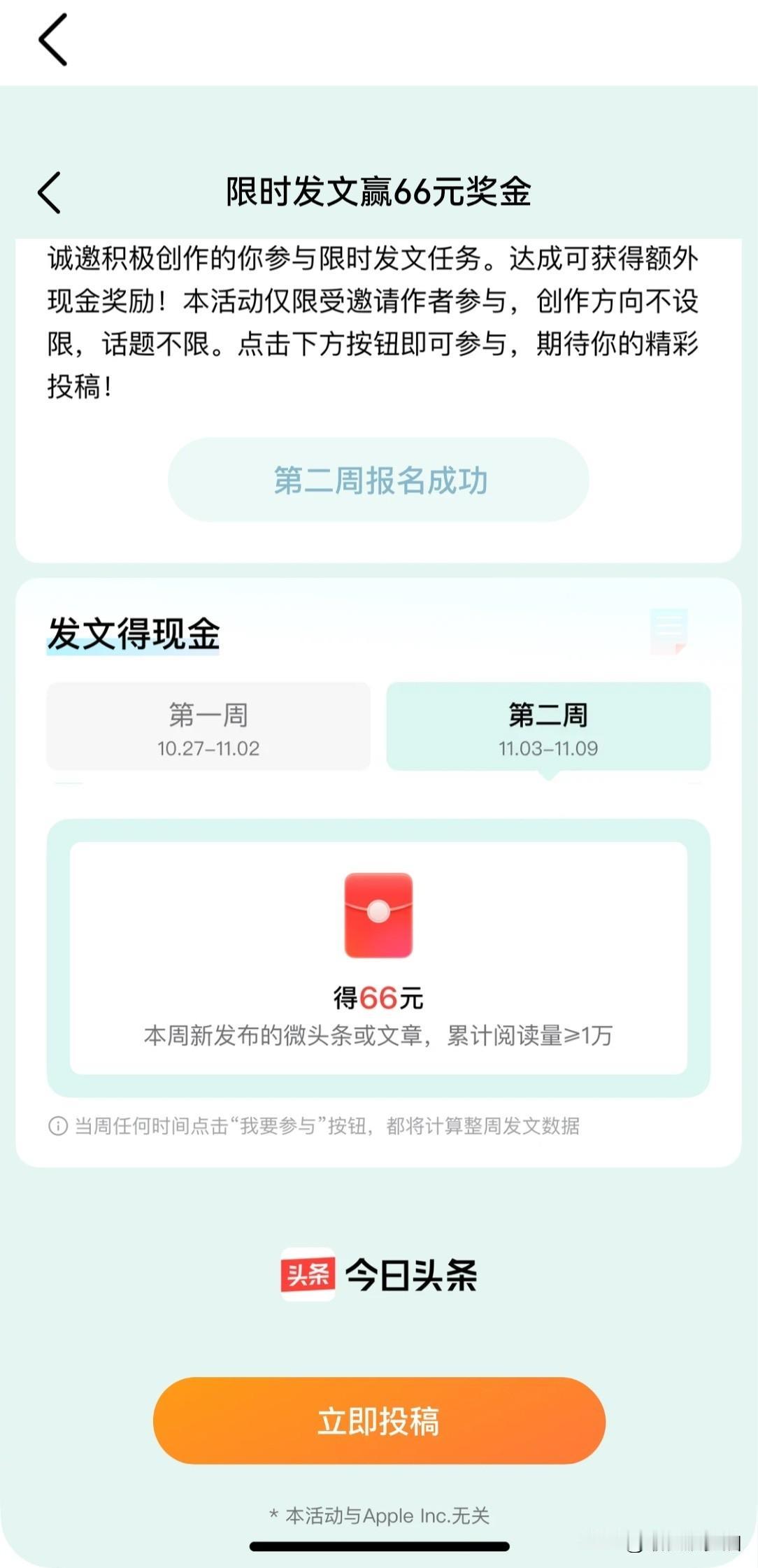 今天是“限时发文赢66元奖金”活动的最后一天了! 参加活动的小伙伴们, 你们的阅读量达标了吗? 昨天我的流量只能用“惨不忍睹”四个字来形容了! 前面发布了三条微头条和一篇文章, 展现量跟阅读量都不好。 幸好, 昨晚最后一条微头条流量就开始变好了! 今天早上发布的微头条, 展现量跟阅读量也是蹭蹭地涨, 涨势喜人啊! 到目前为止, 这条微头条已经获得了51133的展现量, 7115的阅读量, 也算是近期的高光时刻了! “限时发文赢66元奖金”活动已经成功达标了, 不用再担心了! 还没有完成任务的小伙伴们, 要加油哦! 只要每天努力一点, 在参加活动期间比平时多写一两个作品, 流量不就咔咔的来了嘛! 记住了! 想要获得好一点的流量, 那必须要多写! 只有通过持续的输出, 保持账号的活跃, 流量自己就来了! 大家可以去看看头条上的各位大佬们, 比如素老三老师, 26万粉丝的大咖, 除了写长篇小说, 每天还保持着日更7~8个微头条, 写作量惊人! 还有断更后重返头条的宁静的红7788老师, 19.7万粉丝的大咖, 每天也是通过大量写作提高账号活跃度, 最多时一天写8条微头条! 以上两位大神, 都是我们普通人学习的榜样! 大佬们已经这么优秀了, 还这么努力, 每天六点多就开始更新作品, 我们这些普通人还有什么资格不努力呢?