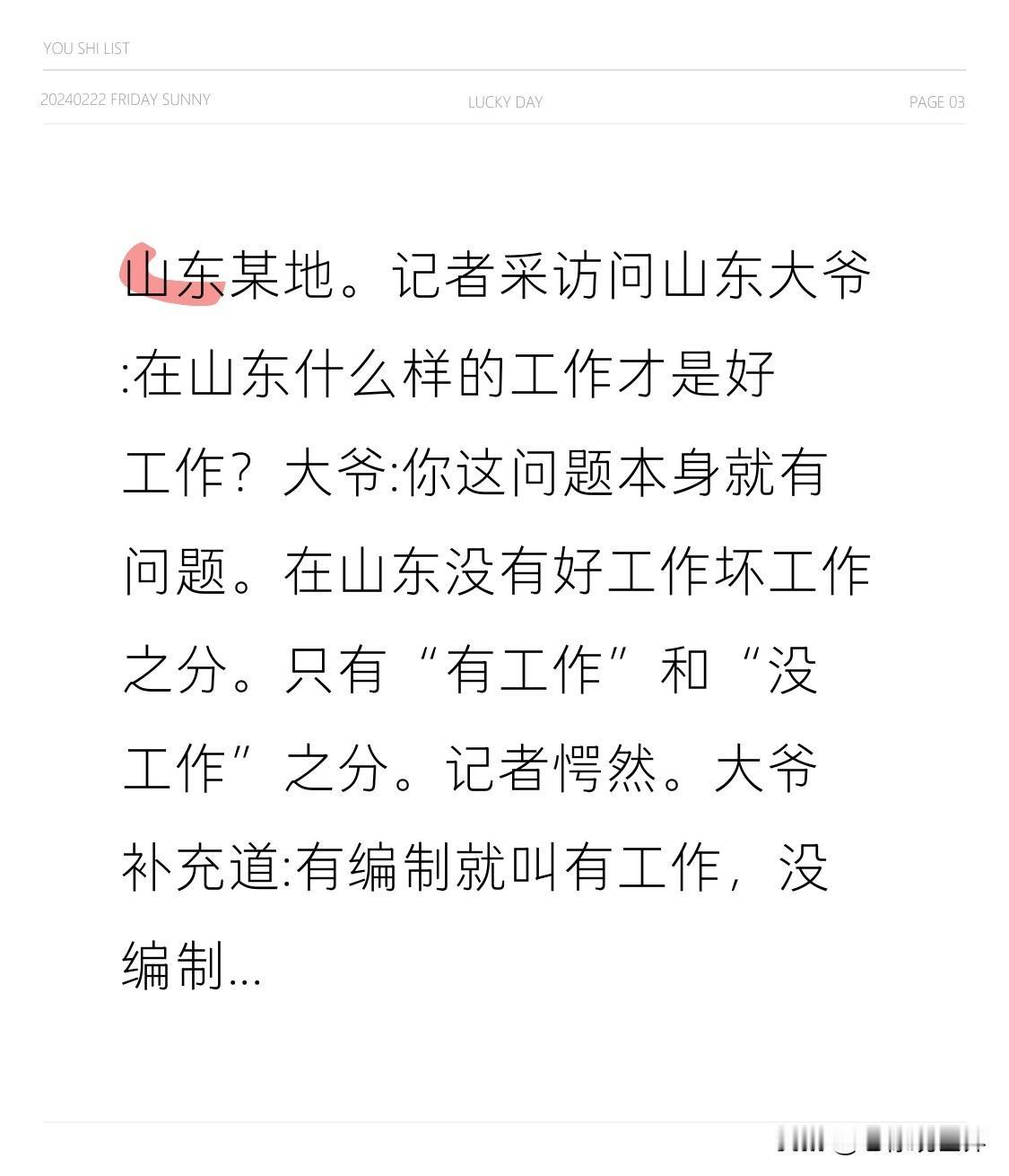 山东某地。 记者采访问山东大爷:在山东什么样的工作才是好工作? 大爷:你这问题本身就有问题。在山东没有好工作坏工作之分。只有“有工作”和“没工作”之分。 记者愕然。大爷补充道: 有编制就叫有工作,没编制那就是没有工作!山东工作 山东求职现状 山东就业环境