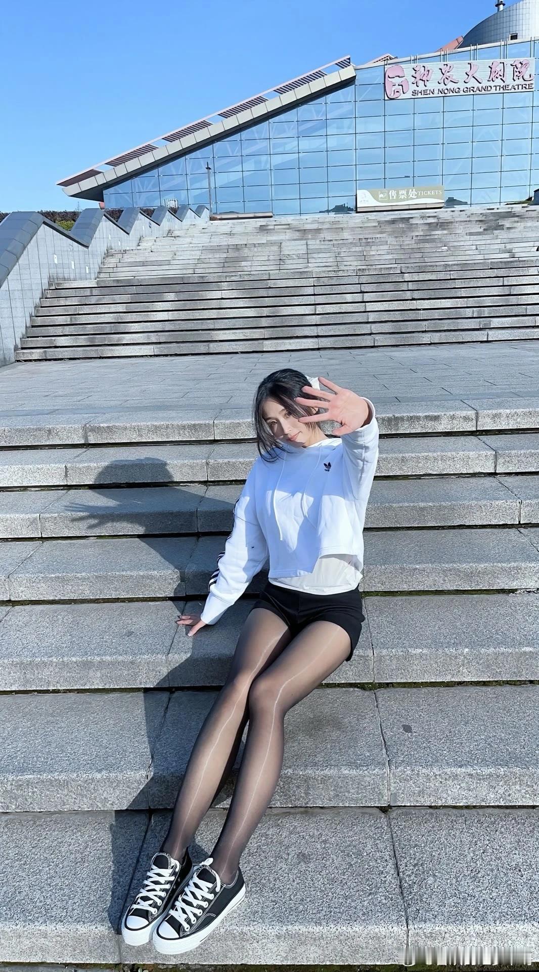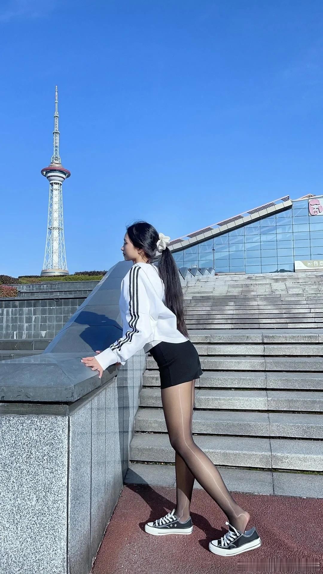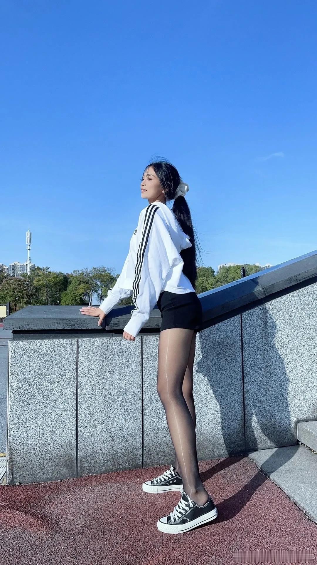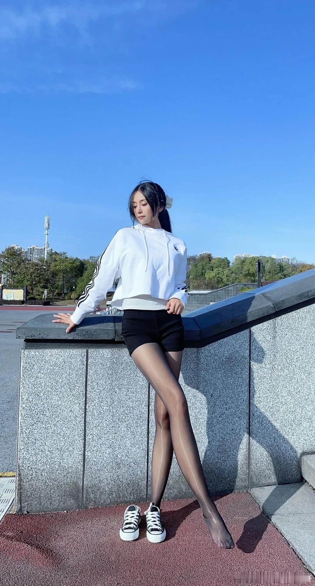细波点薄黑丝搭高腰短装+浅鞋,柔焦腿型还能秒拉三七分比例,甜酷又显长。时尚穿搭丝