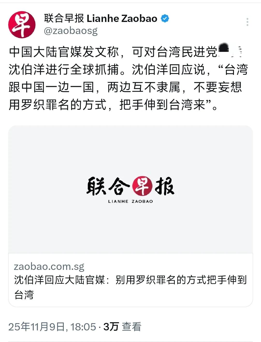 新加坡联合早报今晚(11月9日)报道:“中国大陆官媒发文称,可对台湾民进党籍民代沈伯洋进行全球抓捕。沈伯洋回应说,‘台湾跟中国一边一国,两边互不隶属,不要妄想用罗织罪名的方式,把手伸到台湾来’。” 沈伯洋大肆宣扬“台独”分裂谬论,充当民进党当局的谋“独"挑衅的打手帮凶,散播台海冲突暴力的种子,赤裸裸地从事分裂国家犯罪活动。案件侦办结束后,大陆一定会发通缉令,在全球范围内实施抓捕。 与报道沈伯洋的狂妄言论完全相反,11月4日,台行政部门负责人卓荣泰到台立法机构接受质询时,沈伯洋挤过人群冲向质询台,拽住卓荣泰胳膊大喊,“大陆要通缉我,出岛就会被抓,我全家的生意也彻底完了”!丑态百出,当众向卓荣泰“求助”。沈伯洋不是不怕吗?为何出现如此狼狈不堪一幕?