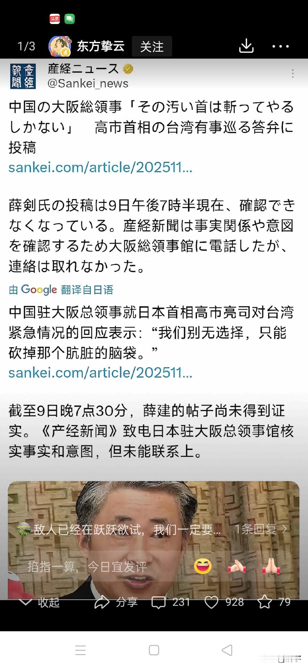 霸气!中国对日本不再克制,发出了清算强音! 日本首相高市早苗继续作妖,竟然妄称“台湾有事”而可能动用武力后,中国对日本高市早苗政府不再克制,我们驻大阪总领事薛剑先生迅速在日本发起了反击,他在转发了相关新闻之后,在后面加上了评论:“擅自伸过来的肮脏脑袋,只能毫不犹豫地砍掉。你做好觉悟了吗!”相信薛剑领事这句霸气侧漏的宣言,说到了每一个爱国者的心坎上,因为大家都知道,三千多万人的血海深仇,既然得不到作恶者们的一声真诚道歉和忏悔,那么,唯一能做的就是用以牙还牙的方式来洗刷耻辱。广大网友们早已说过,伟人不接受日本人的战争赔偿,就是用不放过的态度将血债血偿的机会留给子孙后代。幸运的是,经过70多年的奋发图强,我们终于具有了清算强盗的实力。可以说,此时此刻高市早苗如此挑衅,正合我意,一句直指敌酋脑袋的强音迸发,合情合理又解气!80多年了,我们终于可以对日本不再克制,喊出了压抑在国人几代人心中清算日本的呐喊,太解恨了。有理由相信,每一个爱国者都支持薜剑领事,更支持相关的行动!若有召,必响应!