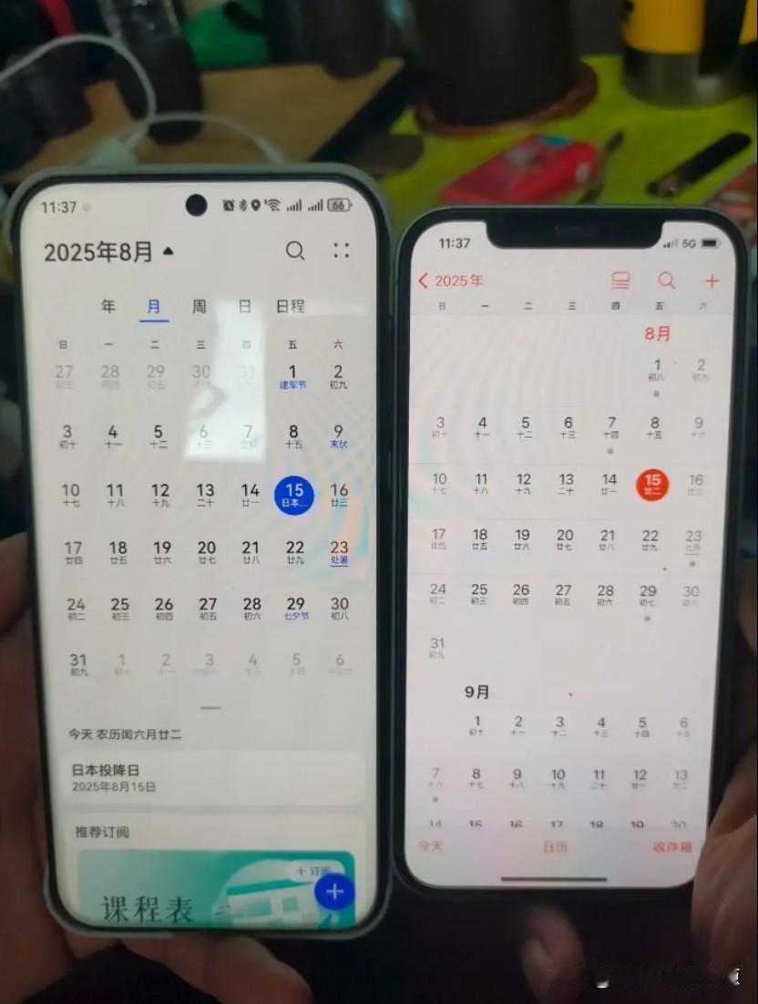一部手机标注了日本投降日,一部手机只说了几月几号 左手一部vivo,右手一部iPhone 都显示着2025年8月的日历,核心聚焦在8月15日:左边日历标注了“日本投降日”,还附带农历“六月廿二”的信息,界面里能看到建军节、七夕节等节日标记,底部还有“课程表”入口;右边日历则用醒目的红色圈出15日,同步显示了农历日期,下方还延伸出9月的部分日期。 vivo手机通过标注“日本投降日”,让这个特殊日期更醒目,也多了一份纪念意义。