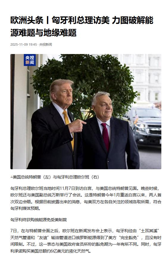 匈牙利总理欧尔班再次被美国无情打脸!观察网消息,匈牙利11月8日表示,在进口俄罗斯石油和天然气的问题上已经获得了美国方面的“无限期豁免”。 但白宫方面的一名官员表示,匈牙利获得的此项豁免仅有一年的时限。 还顺带揭了底——匈牙利早就承诺要花6亿美元买美国液化天然气,还要掏7亿美元买美国国防装备,甚至把核能产业都敞开了门,让美国西屋公司进来分蛋糕,这哪是什么“豁免”,分明是拿自家利益换的短期续命符,连核燃料都得从美国买,等于把能源命脉又多交了一只手攥着。 欧尔班总觉得自己能在美俄欧之间玩平衡,可匈牙利的家底根本撑不起这份野心。 作为个内陆国,连个出海口都没有,能源供应全靠管道输送,全国74%的天然气和86%的石油都来自俄罗斯,家里那座提供一半电力的保克什核电站,以前全靠俄罗斯的技术和核燃料,扩建项目还被美国制裁过,停工好几个月,最后还是靠主动递橄榄枝才换来了制裁解除。 这处境就像被掐着脖子讨生活,却偏要喊着“我能自己喘气”,之前欧盟搞对俄制裁,匈牙利通胀直接飙到25.7%,创下1996年以来的新高,一年多花了114亿美元能源费,教育、医疗的钱都被掏去填了能源窟窿,欧尔班自己都吐槽制裁“砸中了欧洲的肺”,可转头就敢跟美国叫板要“无限期豁免”,着实有点自不量力。 要是把欧盟和北约这层外衣扒掉,匈牙利的国际分量简直轻得可怜。 从历史上看,这国家早就习惯了靠依附别人过日子,冷战后把关键工业、银行、电信和能源部门都卖给了外资,自己成了别人的经济附庸,2008年金融危机一来,没有欧盟的资金输血差点撑不下去。 这些年更是把欧盟当成提款机,却还总跟布鲁塞尔唱反调,结果欧盟一怒之下扣留了疫情复苏资金,匈牙利货币福林立马兑欧元贬值超10%,兑美元贬了20%,通胀飙升到欧盟第一,这就是没了靠山的真实反应。 军事上更别提了,1999年加入北约才算是有了安全保障,2004年干脆取消了义务兵役制,国防军规模小得可怜,连自家边境都得靠北约罩着,真要是脱离北约,在俄乌冲突的大背景下,估计连安稳日子都过不上。 再看看欧尔班那些“想上桌”的操作,俄乌冲突里非要特立独行,反对给乌克兰送武器,不允许借道运装备,还直言“美国停送武器才能和平”,把自己扮成和平使者,可背后全是利益算计——一旦断了俄能源,本国经济就得崩盘。 可美国和欧盟根本不吃这一套,美国直接把它当成“政治对手”,欧盟多次拿“民主倒退”说事,动不动就威胁停掉资金,最后欧尔班还不是得妥协,不仅买美国能源,签《阿尔忒弥斯协定》跟着美国搞太空探索,连费城到布达佩斯的直航都得盼着美国航空公司恢复,活脱脱一副“嘴上硬气身体诚实”的模样。 之前还想竞争中东欧天然气分销中心,结果连邻国奥地利都比不过,只能乖乖从奥地利转输西方天然气,连能源管道都得看别人脸色。 这次能源豁免的时间差,说白了就是美国给的一点小恩小惠,既不想让匈牙利真的跟俄罗斯绑太紧,又得敲打着不让它太跳脱,毕竟留着这个欧盟和北约里的“异类”,说不定哪天还能用来牵制欧盟。 可欧尔班偏要往自己脸上贴金,把短期交换说成长期特权,被拆穿后更显得滑稽。 要知道,匈牙利全年的GDP还不如一些欧洲大国的城市,军力连自保都勉强,要是没了欧盟的市场和资金、北约的安全保护伞,别说在美俄之间找平衡,恐怕连跟周边国家讨价还价的资本都没有,国际上真就成了没人在意的小透明,说句三流都抬举了。 这种明明依附别人却偏要装强硬的戏码,欧尔班也不是第一次演了,可每次都被现实狠狠打脸。 毕竟国际舞台从来都是看实力说话,没有欧盟和北约这两张会员卡,匈牙利连跟美国坐下来谈的资格都没有,更别说要什么“无限期豁免”了。 这次被戳破谎言,也算给欧尔班提个醒:想上桌得先看看自己的碗里有多少硬菜,光靠喊口号可撑不起场面。