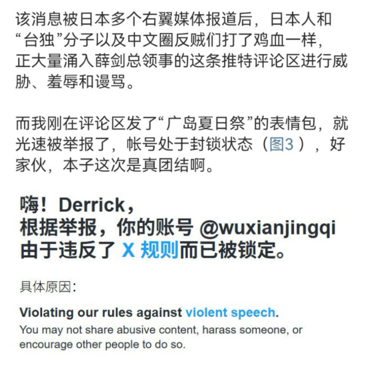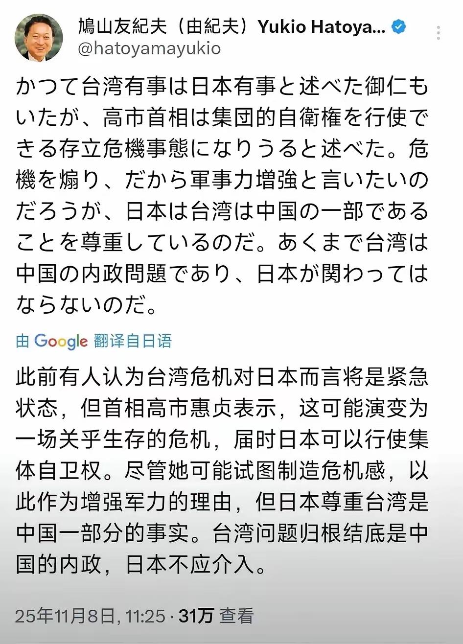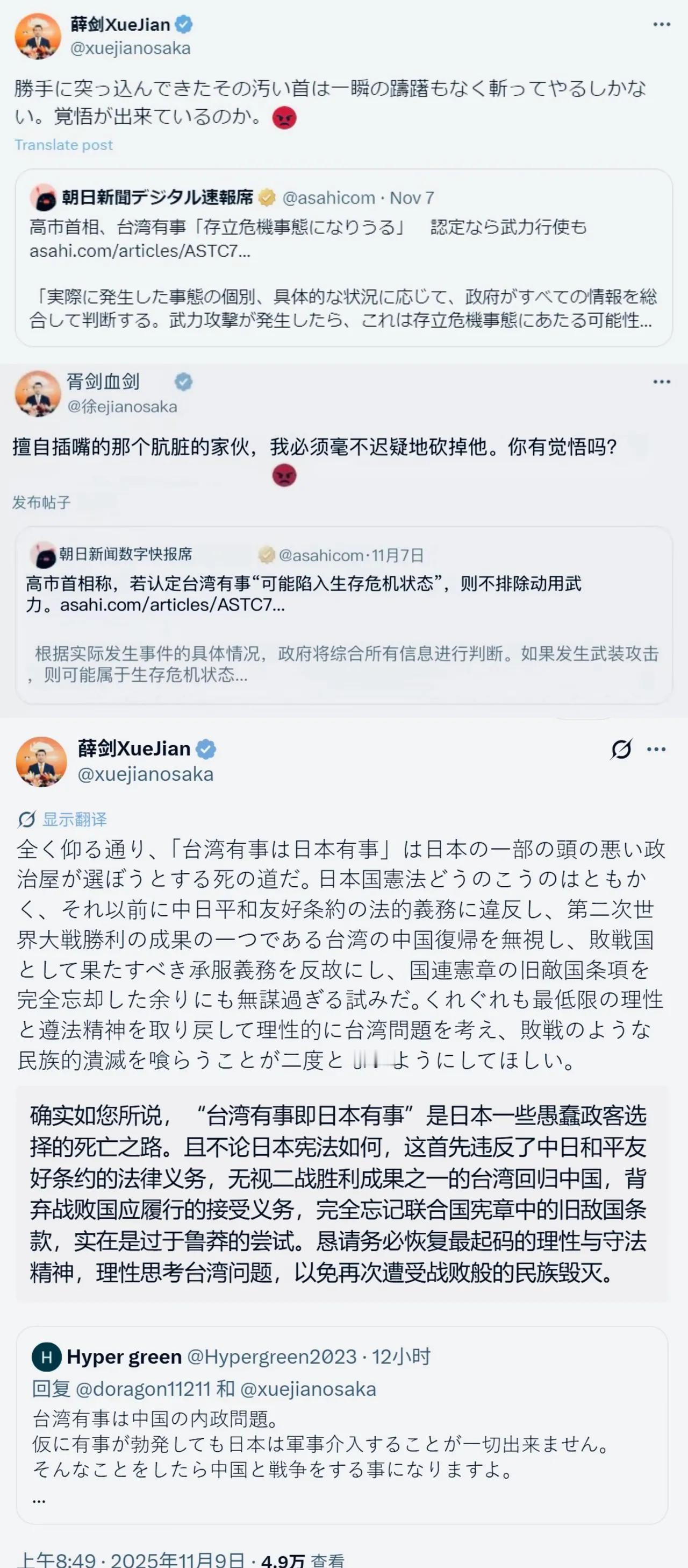 日本议员渡边康平嚣张喊话:应该将中国驻大阪总领事薛剑驱逐出境! 中国网友强势支援,账号遭批量封锁! 11月以来,日本政客涉台不当言论引发的外交风波持续发酵,中国驻大阪总领事薛剑的强硬回应更是引爆舆论,成为热议焦点。 高市早苗在11月7日公开声称“‘台湾有事即日本有事’可能动用武力”,并提及行使“集体自卫权”,暗示日本可能军事介入台海。(图一) 面对这一挑衅,中国驻大阪总领事薛剑在社交平台转发现场新闻,配文:“擅自伸过来的肮脏脑袋,只能毫不犹豫地砍掉。你做好觉悟了吗!”这种直白有力的反击,被日本网民以“死亡威胁”为由大规模举报,中国网友评论区里强势支援,账号遭批量封锁(图四)!该帖随后无疾而终。 但反击并未止步,薛剑重新发帖并置顶(图三),直指日本政客的“台湾有事即日本有事”论是“企图选择的死路”,并列三大法理依据: 违反《中日和平友好条约》; 无视台湾回归中国为二战胜利成果; 违背《联合国宪章》旧敌国条款,警告日本“避免重蹈战败覆辙”。 薛剑用最直白语言反击主权挑衅的强硬措辞被解读为中国外交“新常态” 值得关注的是,相关论调后,日本社交媒体及媒体,批评声音很多,特别是鸠山由纪夫在11月8日也公开批评她,给头脑发热的高市泼了一盆冷水。(图二)而日本议员渡边康平见状,竟嚣张喊话要求将薛剑驱逐出境,进一步凸显了部分日本政客的偏执。 截至目前,薛剑的帖子尚未得到证实。《产经新闻》致电日本驻大阪总领事馆核实事实和意图,但未能联系上。 我想,之所以在日本引发热议(图五),无疑是他们听懂了! 在国家主权和领土完整面前,没有妥协退让的余地,最直白的敲打比任何谴责更具有效果。