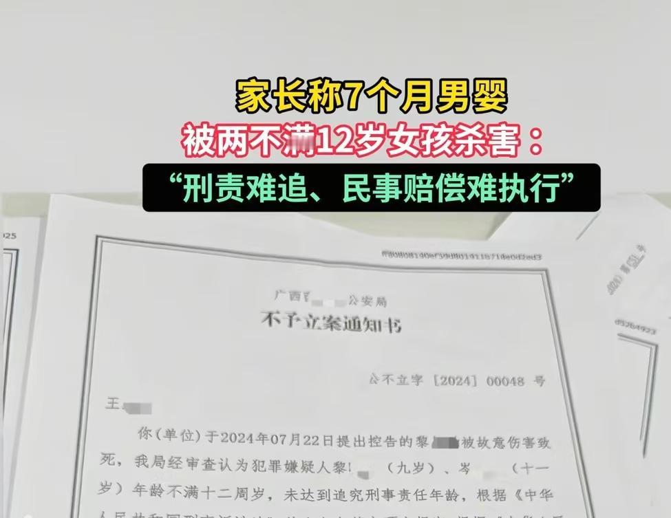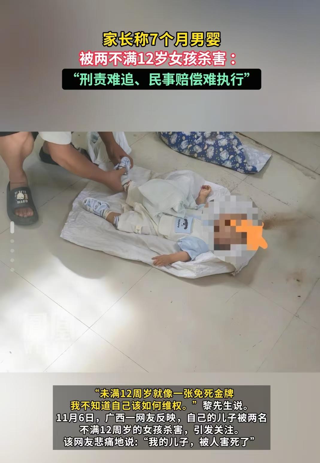 广西百色,7个月大的婴儿。被两名年仅9岁和11岁的女孩残忍杀害,可因为他们未满12岁,警方不予立案,法院虽判赔90万,可对方家长一句没钱,让赔偿成了空话!婴儿父亲:“我孩子死了,她们一点事情都没有,未成年保护法该保护这样的孩子吗?” (来源:红星新闻) “未满12周岁就像一张免死金牌,我不知道该怎么给孩子讨回公道……” 黎先生哽咽着跟记者诉说自己心里的委屈,孩子没了以后,他抑郁了,父母也生病了,妻子更是郁郁寡欢,这个家每天都活在痛苦当中。 时间回溯到2024年7月21日下午,阳光温暖而祥和,可对于小黎一家来说,却是噩梦的开端。 邻居家的两个女孩,一个9岁,一个11岁,来到黎先生家串门。她们趁小黎熟睡之际,将其从床上抱走。 接下来发生的一幕幕,简直令人发指。这两个女孩,对毫无反抗能力的7个月大婴儿,又是拳打脚踢,又是用力掐脖,甚至丧心病狂地将婴儿从高处往下摔,最后还用脚狠狠踩踏。整个残忍至极的过程,持续了大概十分钟。 黎先生的妻子发现孩子不对劲后,心急如焚地抱着孩子往医院狂奔,可是孩子还是抢救无效死亡。 更让小黎一家绝望和无助的是,报警之后,警方却告知不予立案。 黎先生简直不敢相信自己的耳朵,他悲愤地质问:“可她们把我孩子弄死了啊!” 警方解释,因为行为人不具备刑事责任能力,所以依法不予立案。 这个结果,如同一记重锤,狠狠砸在小黎的心上,让他几乎崩溃。 黎先生心想:既然刑事上无法追究,那民事赔偿总该有个说法吧? 于是,黎先生一家起诉了两名女孩和她们的父母。然而,女孩的父母却开始狡辩,声称小黎家里的大人当时在家,听到孩子哭却没出来查看,也有责任。 但法院并没有采纳这种无理的说法,最终判决两名女孩的监护人承担90万元的赔偿责任。 本以为事情到这里,总算有了一丝希望,可女孩父母却轻飘飘地扔下一句“没钱,赔不起”,让这90万的赔偿瞬间化为泡影。 如今,事情已经过去了一年多,黎先生依旧深陷在痛苦和迷茫之中。 孩子没了,凶手却无法被追责,法院判了赔偿,可钱却拿不到,这个家每天都活在痛苦的深渊里。 此事引发热议,有网友说,孩子执行不了,父母有责任,执行父母!没钱,就冻结监护人所有的不动产,以及银行存款,还不够就慢慢还,还不了,纳入失信名单,同时这两个女孩的杀人恶行永久录入个人档案,让这两个小恶棍永远背着。 也有网友说,天啊,胆子怎么这么大,我一个四十岁的人,杀只鸡我都不敢看!这种杀人的孩子为什么要保护他们,保护她们等于对其他人的残忍! 还有网友说,为什么未成年犯罪越来越多,因为他们知道自己犯事情不用承担责任,这就是一个BUG! 我想说的是,年龄,从来都不应该成为犯罪的“免死金牌”。在这起事件中,7个月大的孩子失去了宝贵的生命,这是无法挽回的悲剧。 可是,仅仅因为凶手未满12周岁,就让他们逃脱了应有的法律制裁,这无疑是对法律的亵渎,对受害者家庭的二次伤害。 法律设立的初衷,是为了维护社会的公平正义,保护每一个公民的合法权益。如果因为年龄的因素,让一些恶性犯罪行为得不到应有的惩处,那么法律的威严何在?社会的公序良俗又将如何维护? 我们不能让年龄成为某些人肆意妄为、逃避责任的借口,必须对恶性犯罪依法追责,让法律的利剑高悬,让每一个心怀恶念的人都能感受到法律的威慑。 一个原本幸福美满的家庭,因为这场突如其来的悲剧,变得千疮百孔。7个月大的孩子,还没来得及好好看看这个世界,就永远地离开了。我们多么希望,法律能够给他们一个公正的交代,让凶手受到应有的惩罚,让赔偿能够真正落实,让这个破碎的家庭能够得到一丝慰藉。 同时,也希望这起事件能够引起社会的广泛关注和深刻反思,只有对恶性犯罪依法追责,才能让其他未成年人看清年龄不是护身符,只有对碰触法律红线行为的严惩,才能让监护人意识到教育缺位需承担法律后果,更能让社会传递生命至上的价值导向!