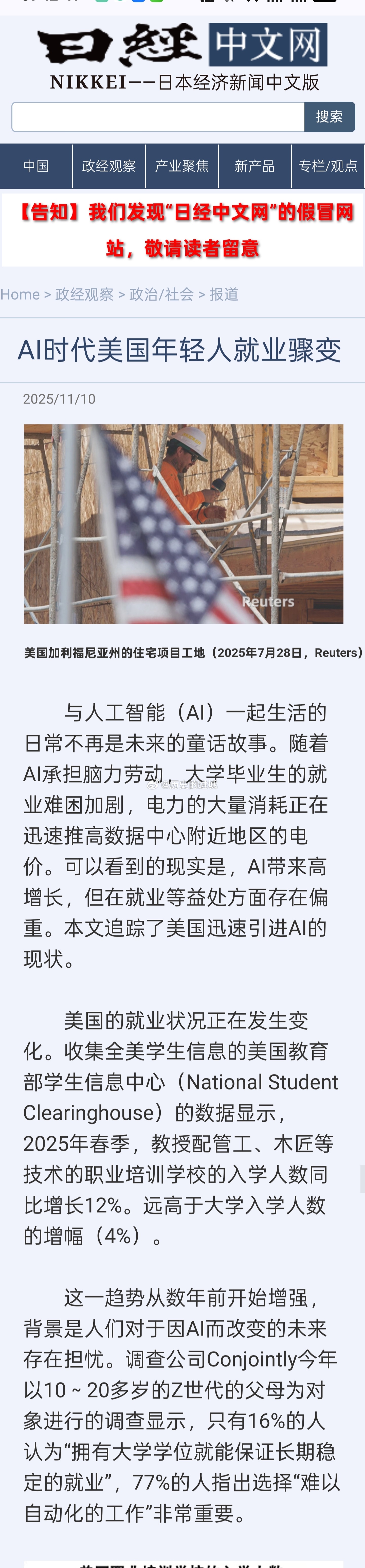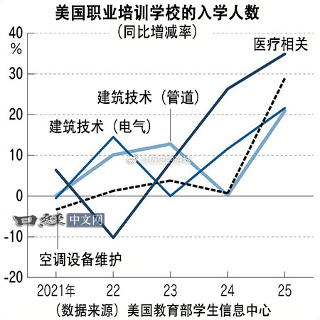 美国教育部学生信息中心(NSC)的数据显示,2025年春季,教授配管工、木匠等技术的职业培训学校的入学人数同比增长12%。远高于大学入学人数的增幅(4%)。这一趋势从数年前开始增强,背景是人们对于因AI而改变的未来存在担忧。调查公司Conjointly今年以10~20多岁的Z世代的父母为对象进行的调查显示,只有16%的人认为“拥有大学学位就能保证长期稳定的就业”,77%的人指出选择“难以自动化的工作”非常重要。