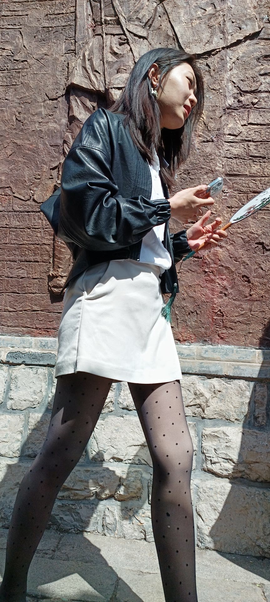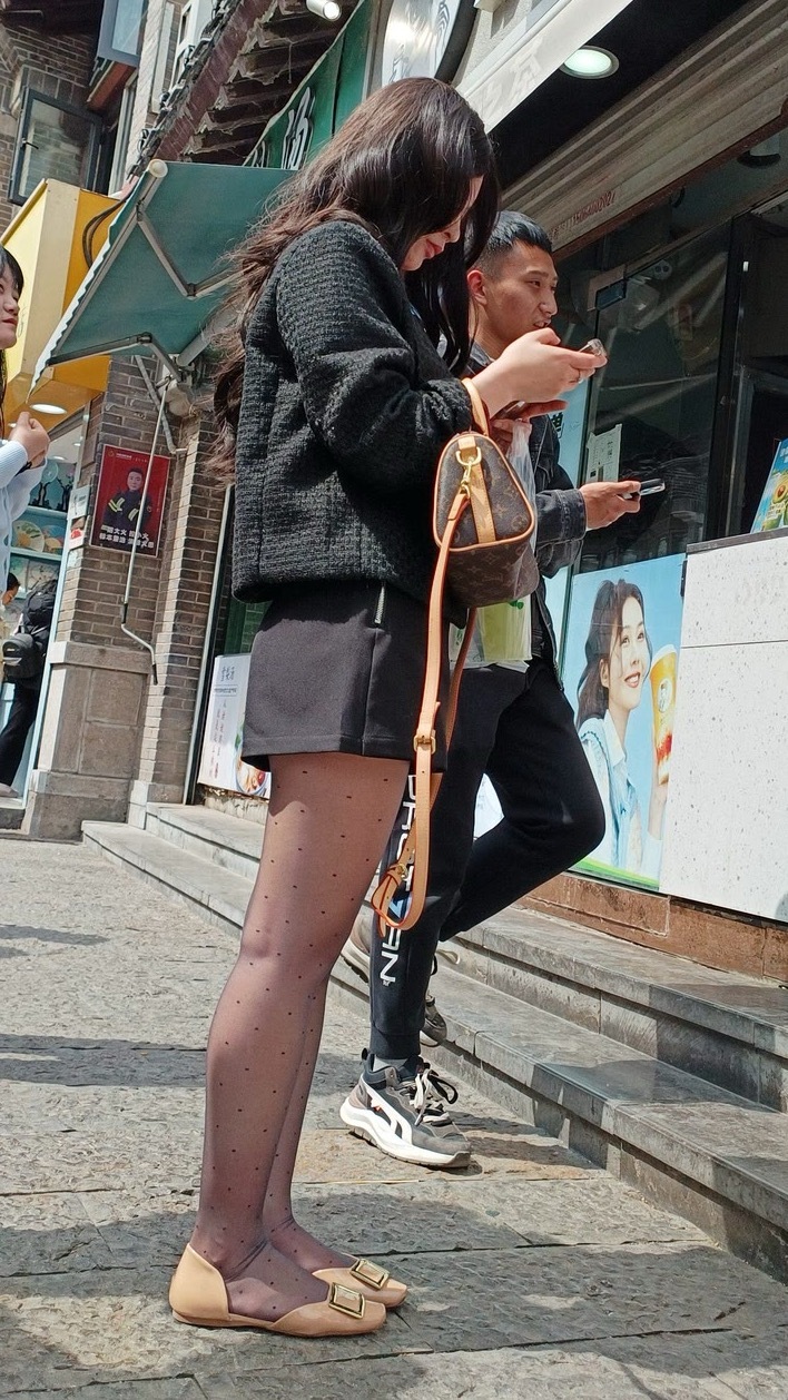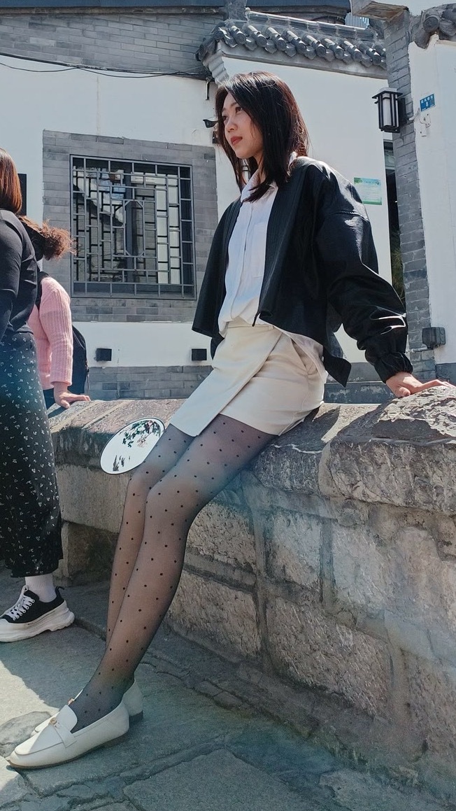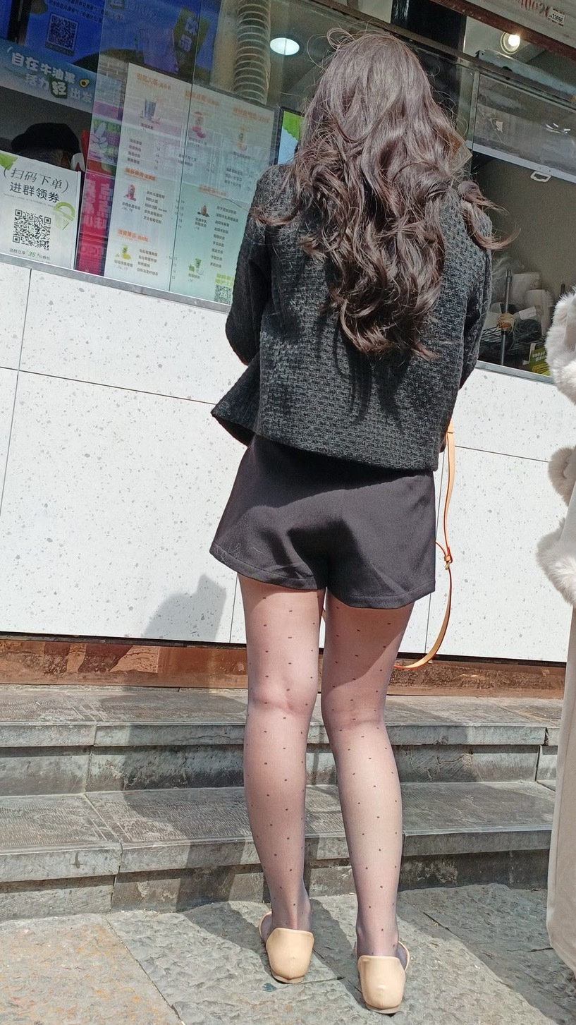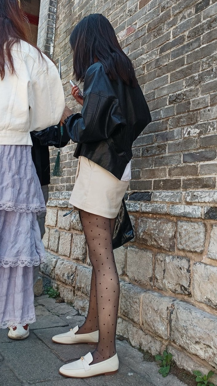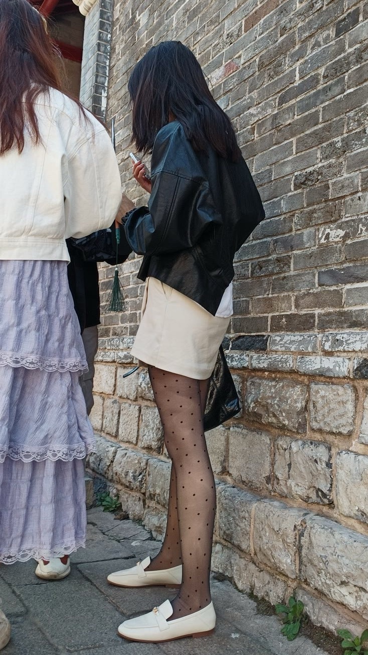 细波点薄黑丝搭高腰短装+浅鞋,柔焦腿型还能秒拉三七分比例,甜酷又显长。