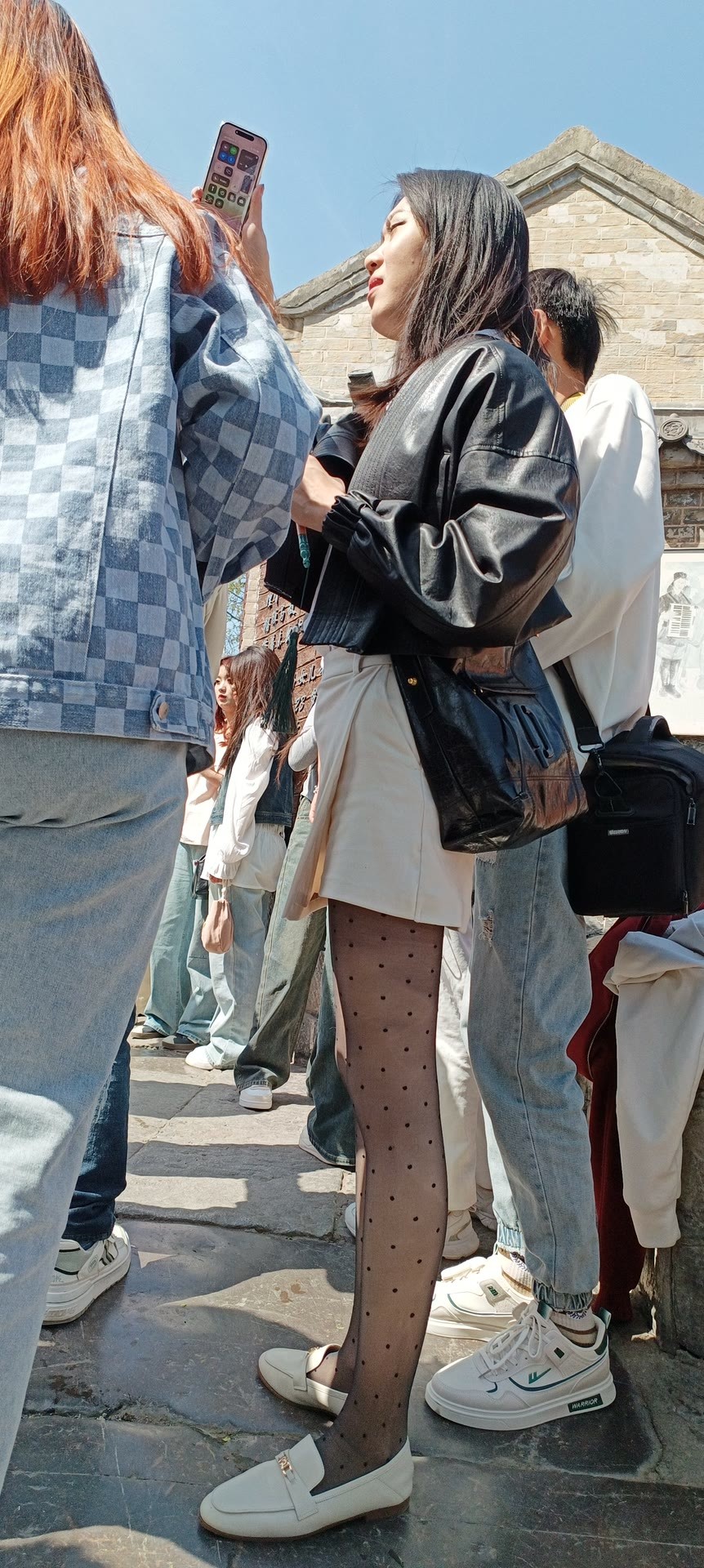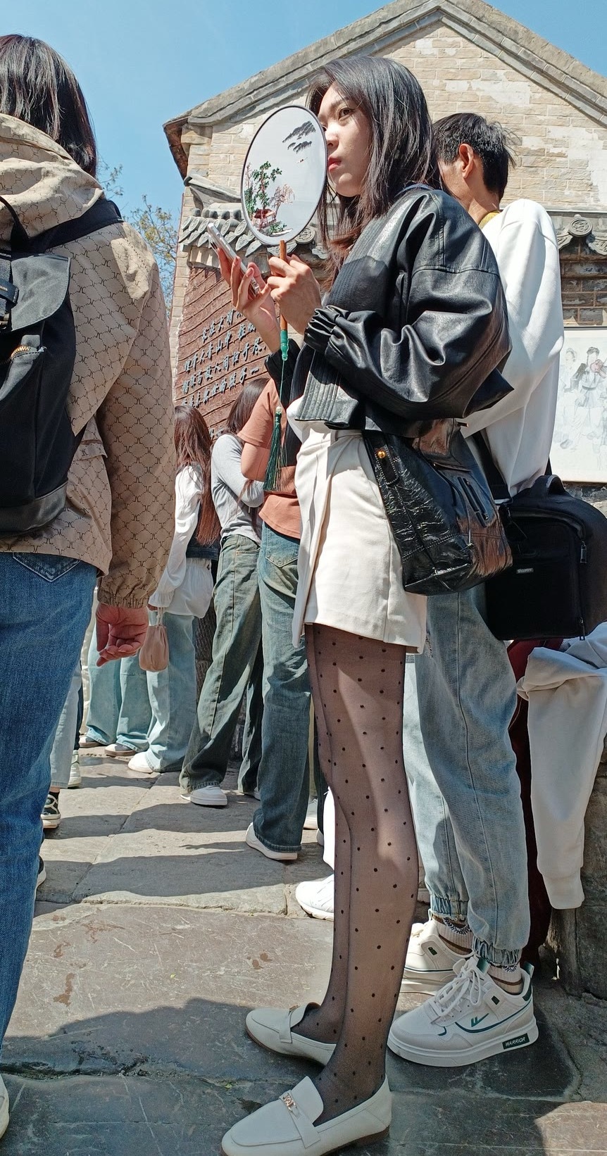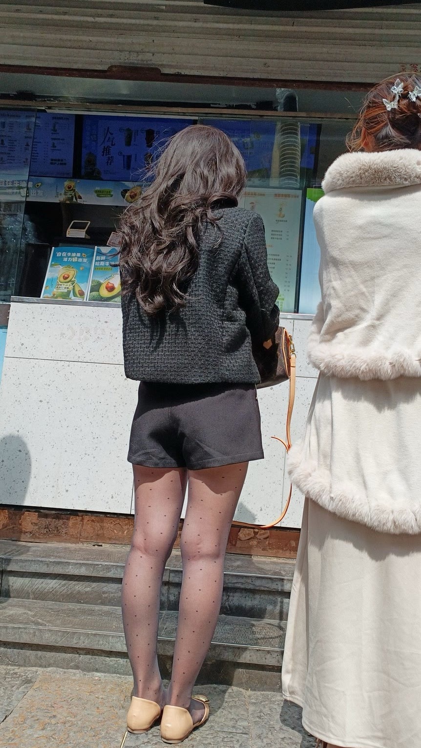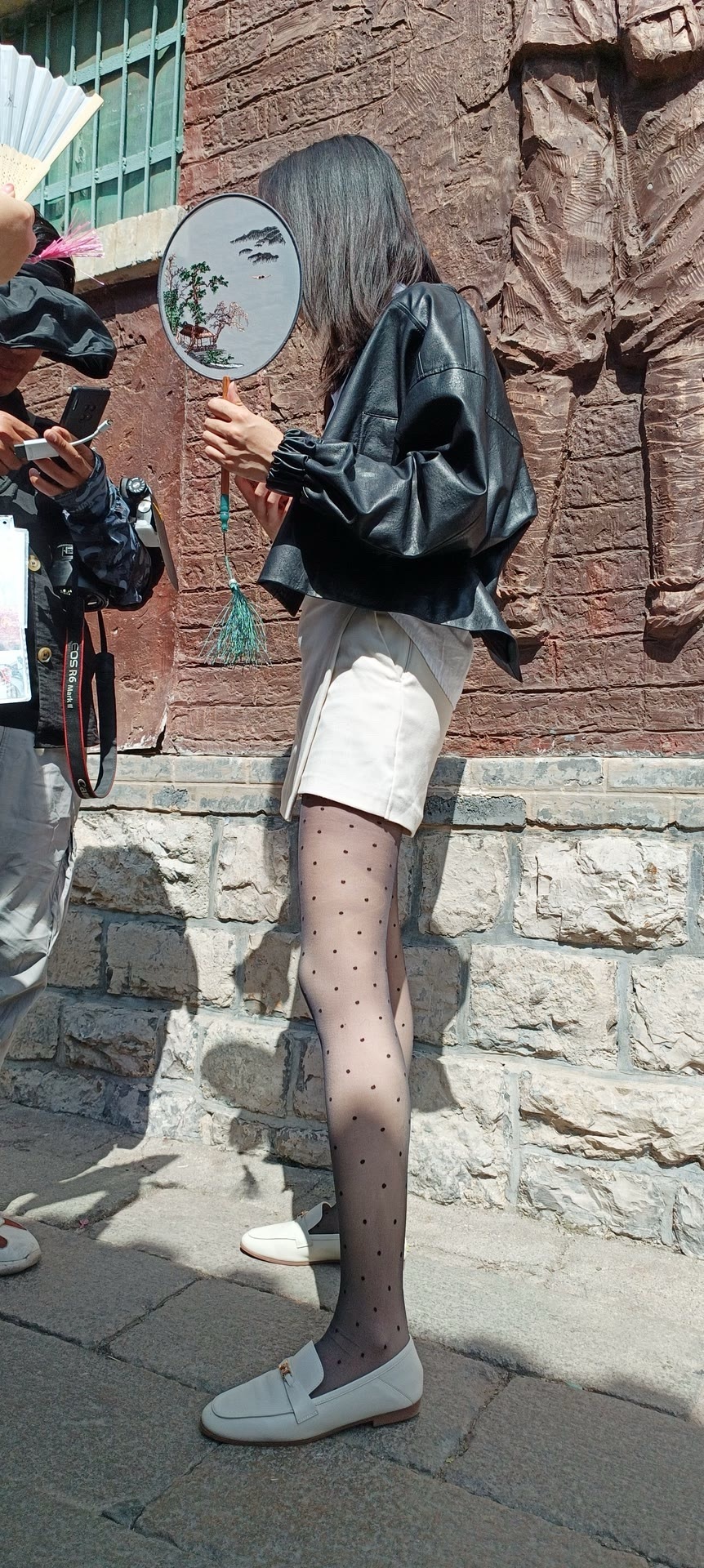 细波点薄黑丝搭高腰短装+浅鞋,柔焦腿型还能秒拉三七分比例,甜酷又显长。