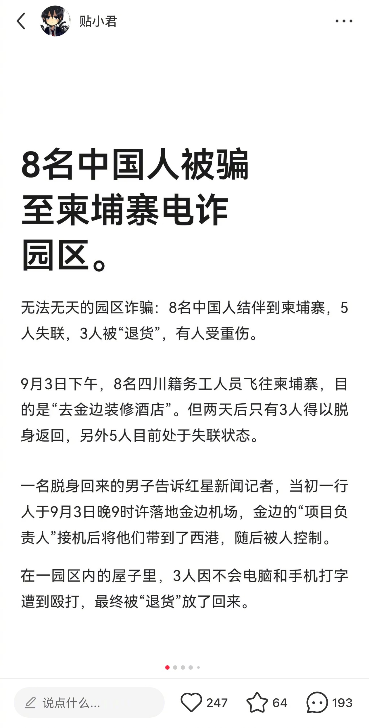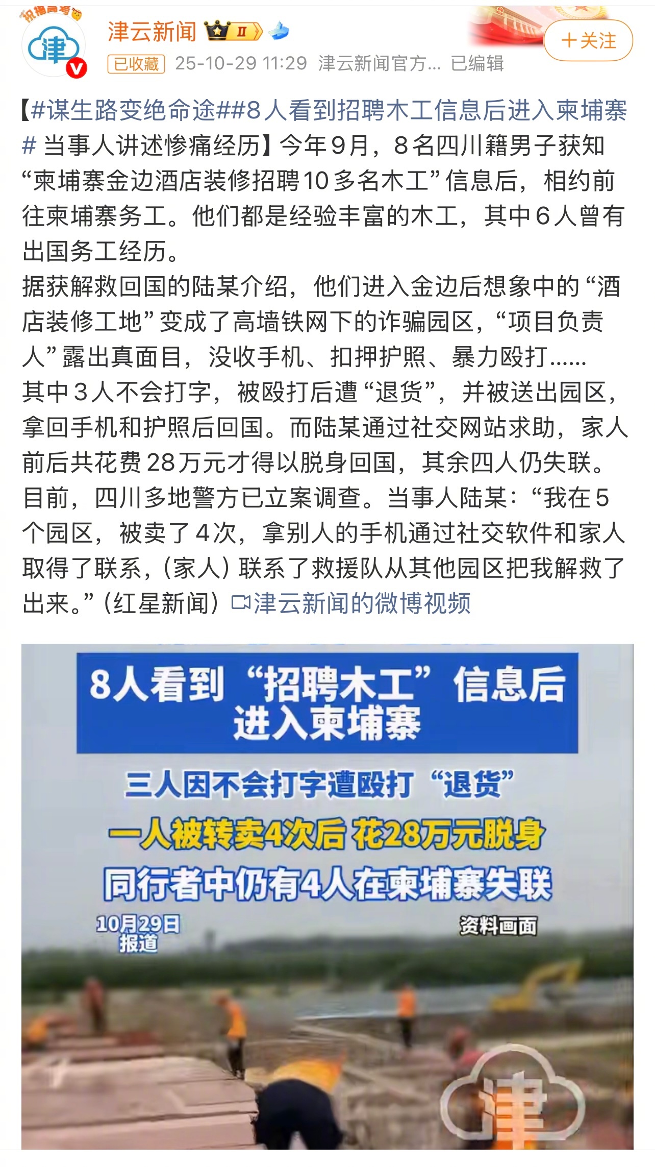 9月初,我发了关于“8名国人出国干装修被骗入电诈园”的报道事迹。