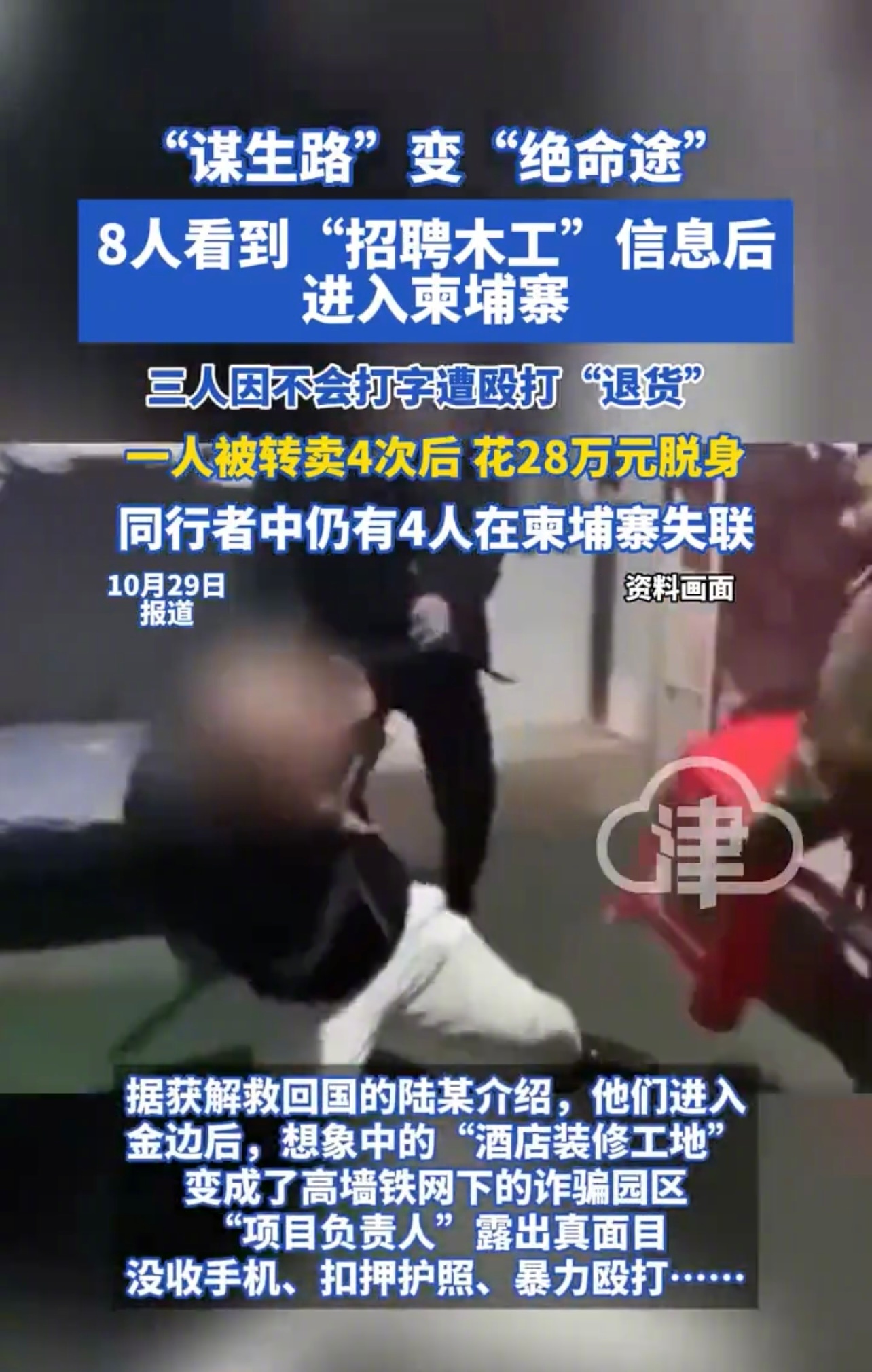 对方以“酒店装修”为名掩盖电诈本质,利用“熟人介绍”降低8人警惕。8人到金边后,“酒店装修工地”变成高墙铁网下的诈骗园,“项目负责人”露出真面目,没收手机、扣押护照、暴力殴打……其中3人不会打字,被殴打后遭“退货”,并被送出园区,拿回手机和护照后回国。而陆某通过社媒账号向我求助。