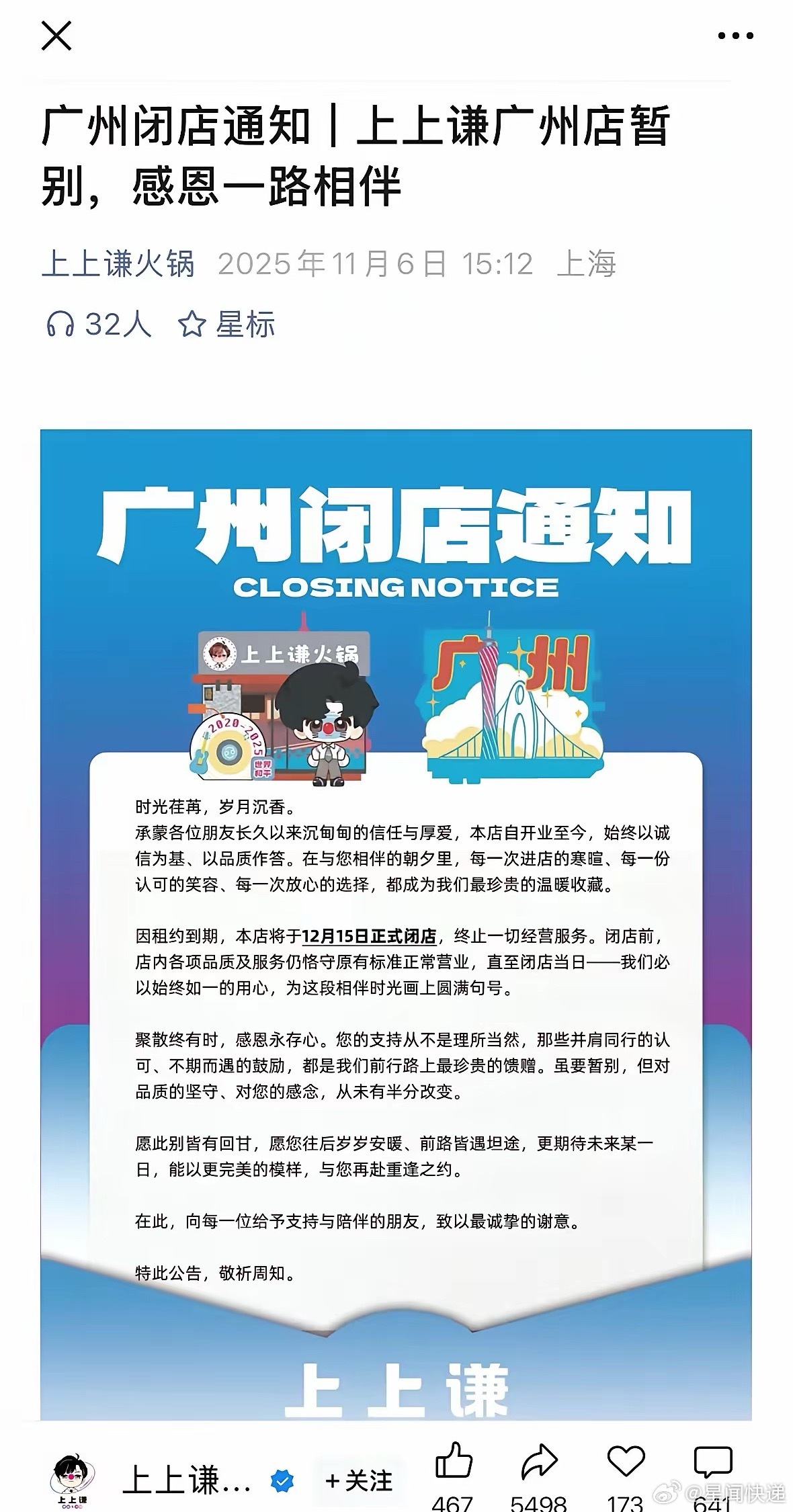 明星火锅店退潮上上谦仅剩上海1家门店刷到上上谦广州店12月15日闭店的消息,才发