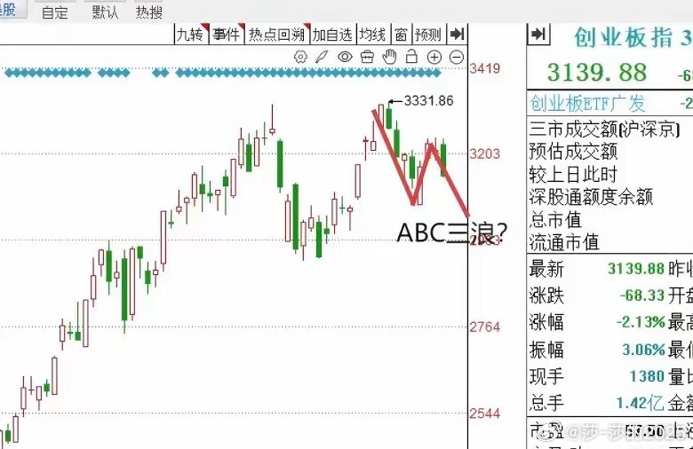 第一,创业板出现了明显的调整。从创业板指数目前的走势来看,出现了放量下跌的走势。创业板今天早盘的跌幅超过2%,那么从目前创业板的走势来看,创业板有可能会走abc的一个三浪结构。大家请看图一,创业板日线图。