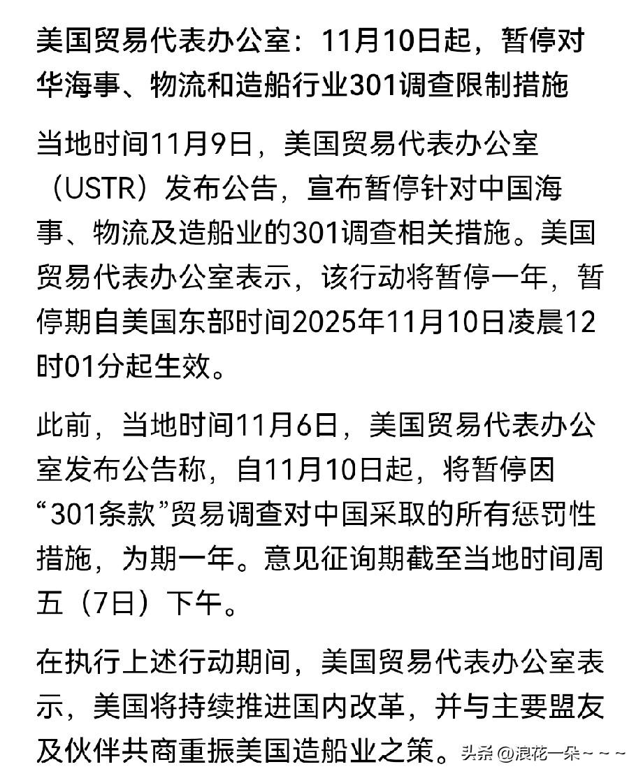 快讯!快讯! 美国算是白折腾了? 就在刚刚,美国贸易代表办公室宣布11月10日起,暂停对华海事、物流和造船行业301调查限制措施! 这既是我方谈判胜利的结果,也是美方企图用301调查限制措施来要获得更大的贸易利润筹码,结果没有要成的结果! 可以说在见招拆招的情况下,美国的算盘珠子算是落空了,他们自我感觉良好的政策没几天又被打回了原形,竹篮子打水一场空。 真是早知今日何必当初。美国这些出馊主意的人,要是把精力用在美国政府关门的问题上,不早就开门营业了。