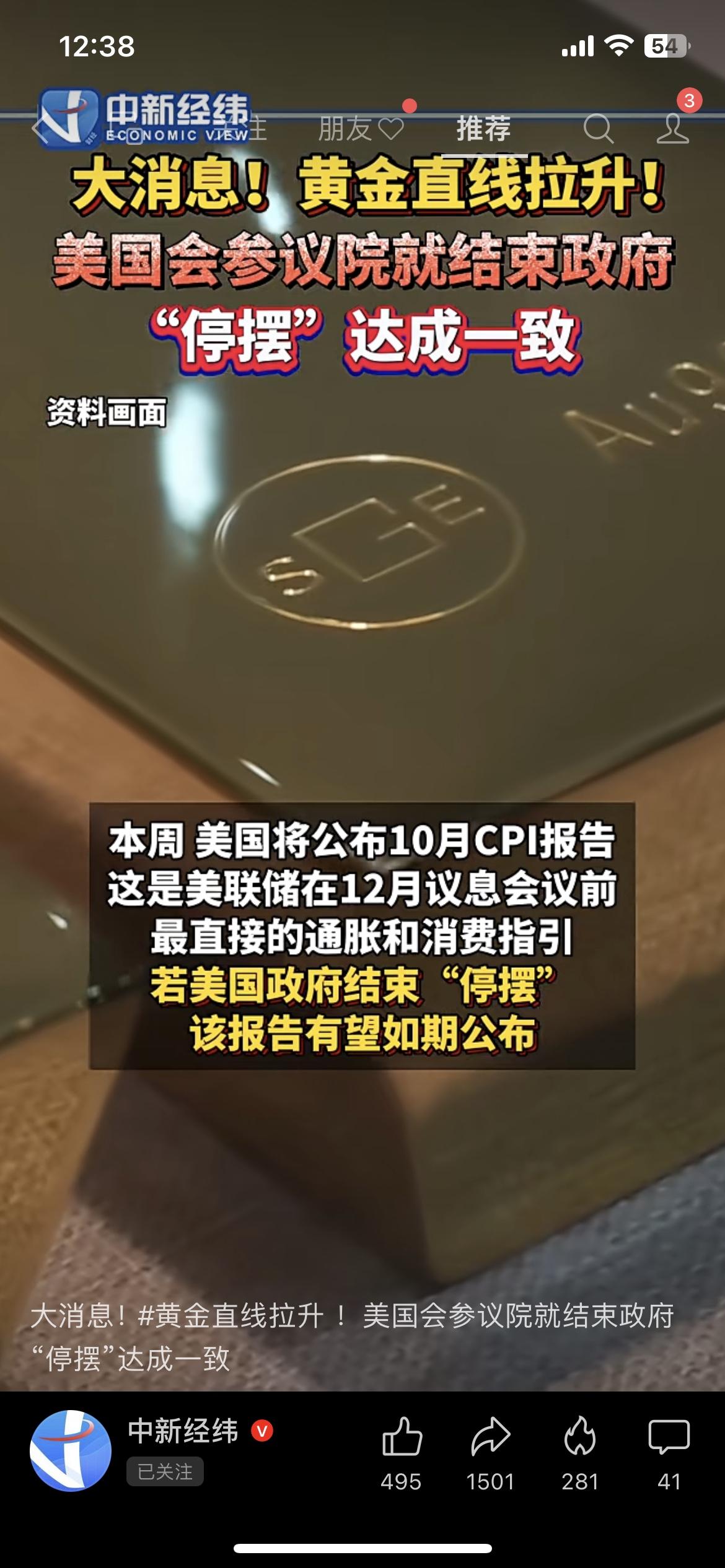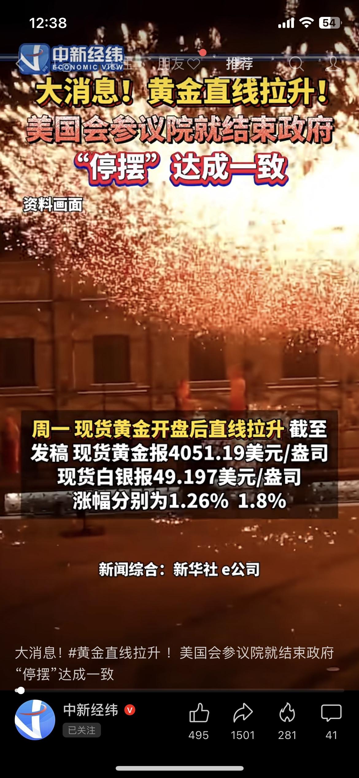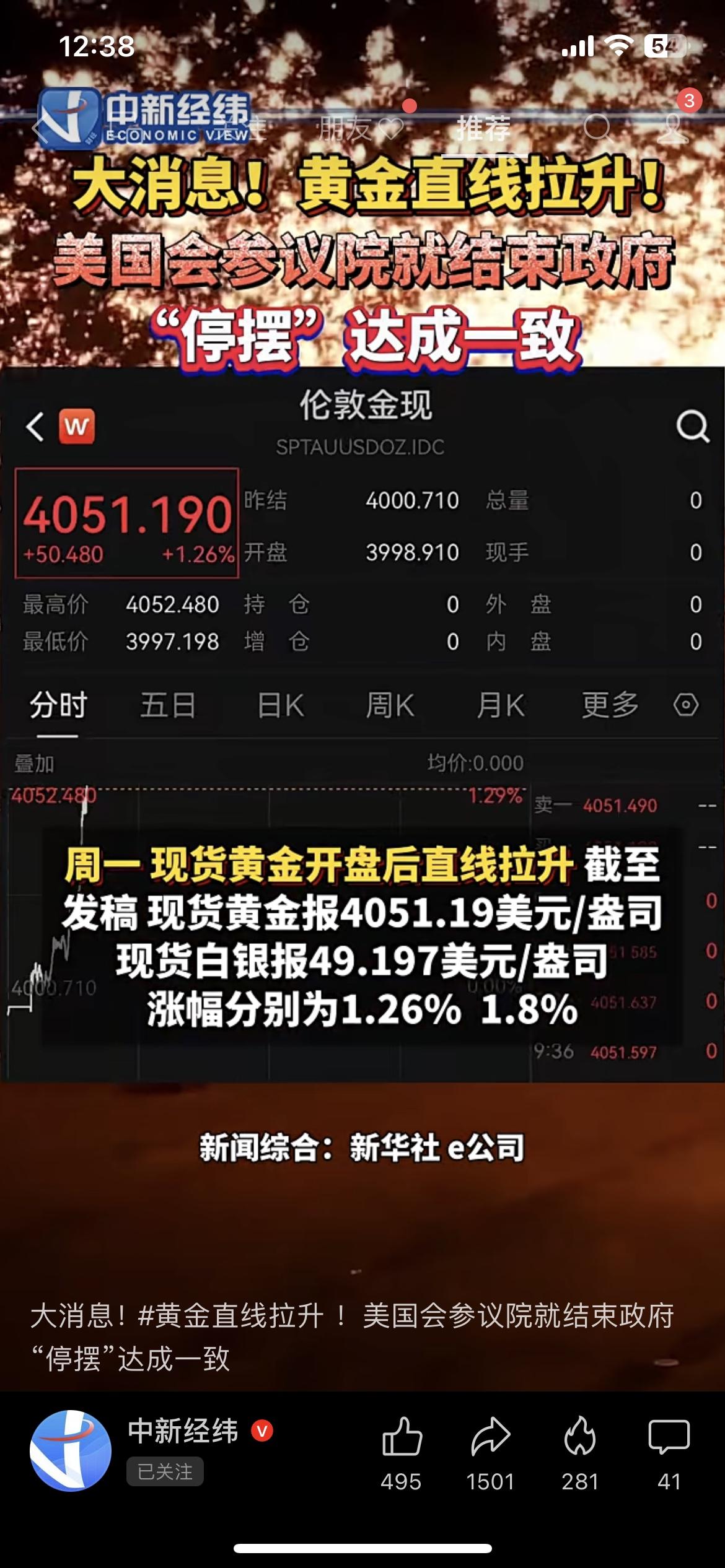 刚出的大消息!黄金突然直线拉升,美国那边有动作了! 家人们谁懂啊!刚刷财经消息直接看愣了——现货黄金今天开盘跟“坐火箭”似的,现在都冲到4051美元/盎司了,一下子涨了1.26%!连白银都跟着涨了快2%,这波行情也太猛了! 到底啥情况?原来是美国参议院刚谈妥了,政府“停摆”要结束了!而且这周美国要出10月的CPI报告(就是通胀数据),这可是美联储12月要不要加息的关键参考。之前政府停摆还担心报告出不来,现在妥了,报告能按时发了! 市场一听到这消息直接动起来了——毕竟政府恢复运转+关键数据要落地,黄金这避险资产直接被带飞! 你们手里有黄金相关的吗?这波算不算捡着意外惊喜了? 黄金暴涨 美国政府停摆结束 财经大事件 黄金行情价格