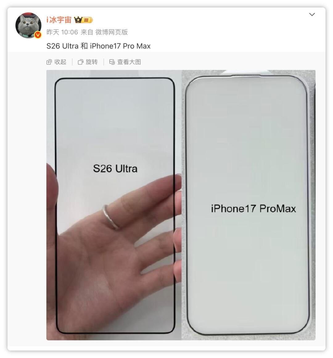 随后,i冰宇宙还放出了一组三星S26 Ultra渲染图与其他机型的对比图,你还真别说,对比着来看这个R角可圆润太多了!