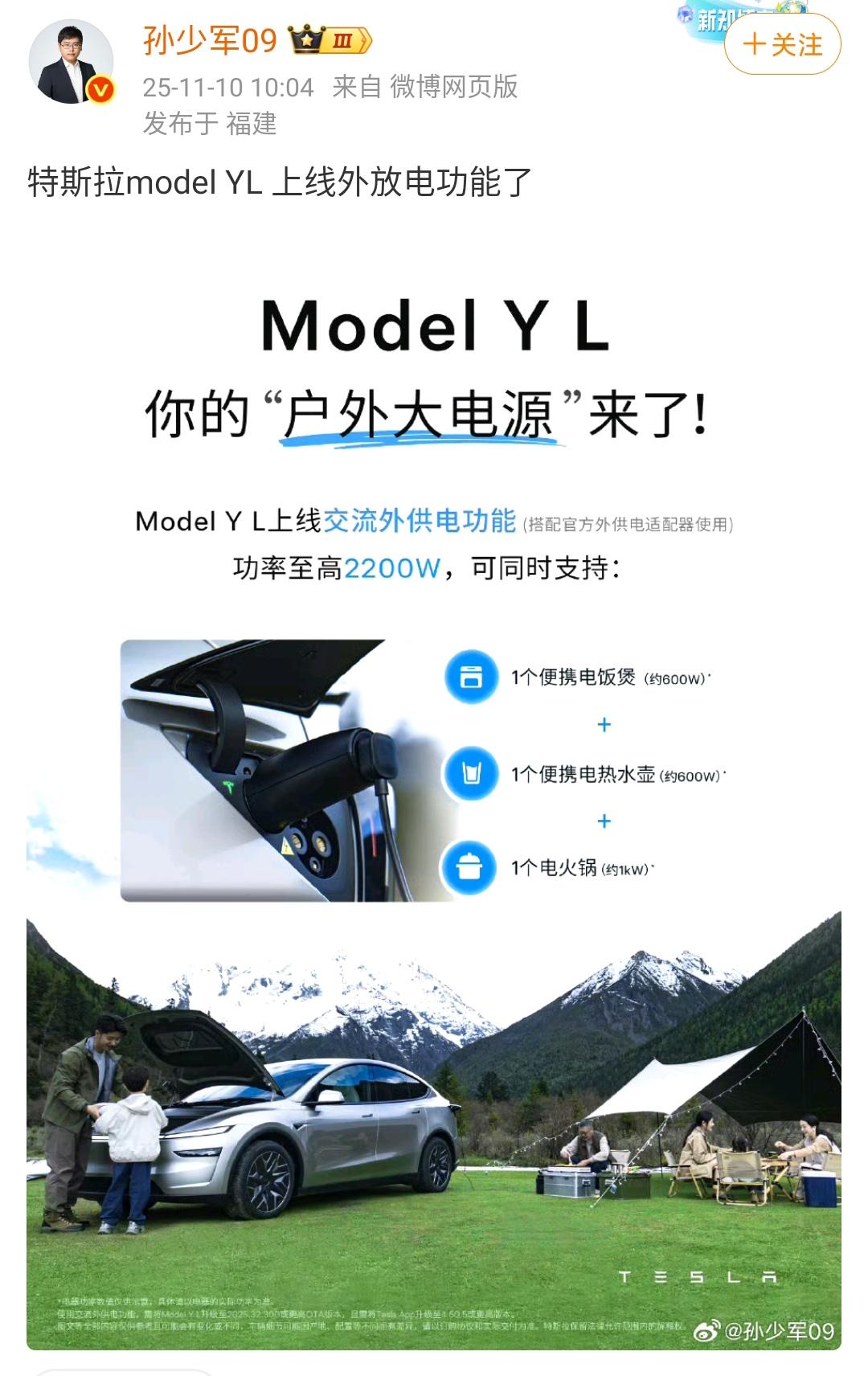 孙少军:特斯拉model YL 上线外放电功能了 ! 这个功能真的是非常实用,没想到特斯拉到现在才OTA,只要汽车有慢充功能的都能实现该功能。 不过这个外放电需要搭配官方的零部件才能实现,不过也有第三方的东西可以自行购买。 各位是怎么看的?欢迎评论区留言。