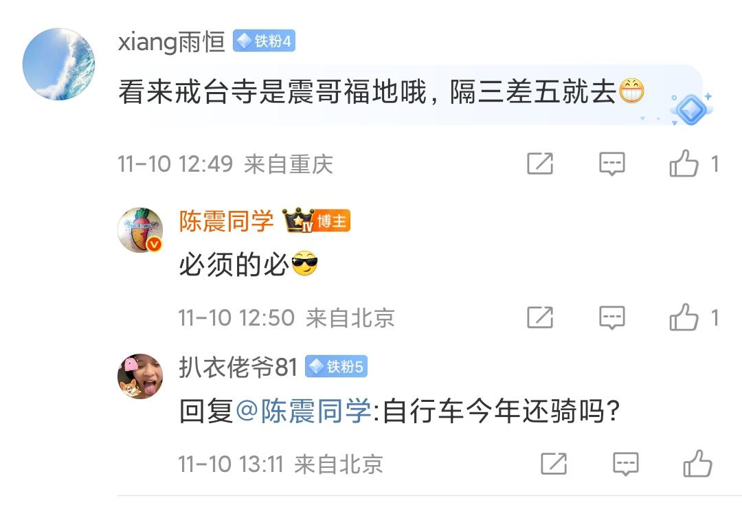 陈震同学:戒台寺 例行打卡~[酷] 网友:看来戒台寺是震哥的福地哦,隔三差五就去打卡。 陈震同学:必须的必[得意] 这个大脚的车就是帅,不过也要提醒各位,大脚的车车速不太适合快了。 各位是怎么看的?欢迎评论区留言。