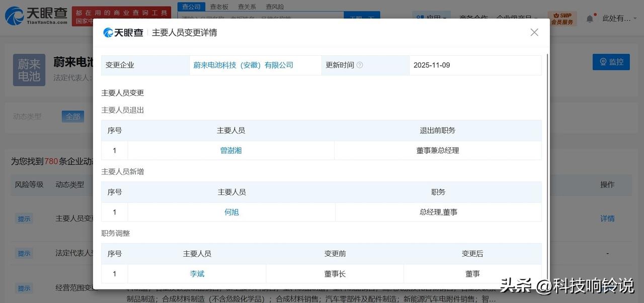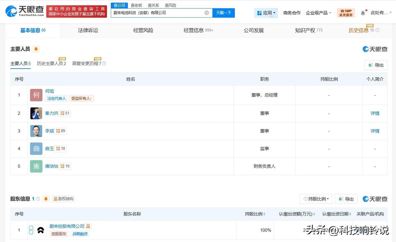 【李斌在蔚来电池科技公司职位发生变更 由董事长变更为董事】 天眼查工商信息显示,近日,蔚来电池科技(安徽)有限公司发生工商变更,李斌由董事长变更为董事,曾澍湘卸任法定代表人、董事兼总经理,由何旭接任。 该公司成立于2022年10月,注册资本20亿人民币,经营范围含电池制造、电池销售、电子专用材料研发、石墨及碳素制品销售、新型膜材料销售、汽车零部件及配件制造、新能源汽车电附件销售、智能输配电及控制设备销售、资源再生利用技术研发、人工智能应用软件开发等。股东信息显示,该公司由蔚来控股有限公司全资持股。 天眼查信息: