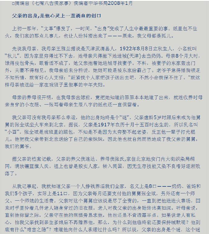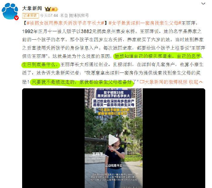 “我是从哪里来的?” 女子悬赏深圳一套房找亲生父母 这个新闻讲的是什么呢? 是1985年出生的一个女性,大约7岁时,被拐卖到了福建。 她通过创业,现在生活富足,在深圳拥有多套房。 但这么多年来,她始终想找到自己的亲生父母,于是悬赏深圳一套房寻找。 这个新闻让我想到的一件事——对于被收养的孩子,应不应该告诉他们是被收养的呢? 相声大师侯宝林是被收养的。 根据他的自述,他不到5岁时,被后来的舅舅抱到北京的。 他一辈子想知道自己是什么地方的人、亲生父母是谁,却始终不知道。 舅舅临终前,他哀求舅舅,想知道自己亲生父母是谁。 但舅舅还是不肯透露半点。图1 郭德纲和于谦的相声《一户侯》里提到过这段。 郭德纲先生说,过去的人有职业道德,都不允许给孩子说,就怕孩子回去找。 这个所谓的职业道德当然是调侃。 但怕说了亲生父母是谁,被收养的孩子会去找亲生父母,对养父母不孝顺,变成白眼狼,这个理由是普遍被认同的。 但这种做法是自私,也是不智的。 因为人是有感情的,不是机器。 感情只能用感情来培养,欺骗是不会得到好的结果的。 我们从小就想知道自己是从哪里来的。 比如小孩子问父母,自己是从哪里来的。 当然,有的父母会给出“从垃圾桶捡的”“充话费送的”之类回答。 但随着长大,我们知道这是玩笑。 这种玩笑并不会让我们产生自我认同的困扰。 但是,对被收养的孩子来说不是这样。 他们并不是都不知道自己是被收养的,即使小时候没有察觉,随着年龄长大,或者周围人的泄密,被收养的孩子是会知道自己不是亲生,而是被收养这个真相的。 一旦成年后才发现这个真相,这种几十年被欺骗的震撼,会给被收养的孩子造成心理创伤。 我们想象一下,自己过去几十年的经历全都是虚假的,自己的父母是假的,父母对自己所说的话是假的,自己是什么感受? 美国电影《楚门的世界》里楚门的经历就是这样。图2 他的人生完全是假的。 从他的出生,到他的成长,他的父母、邻居、同学、朋友、同事、妻子,统统都是假的。 这就是被收养的孩子长大后才知道自己是被收养的真相后的感受。 在美国,20世纪70年代以前,流行的是“封闭式收养关系”。 也就是被收养的孩子不知道自己的亲生父母,也不会和亲生父母联系。 但后来发现这种收养关系是有不健康的,会对被收养孩子的心理造成创伤,同时影响他们和养父母的关系。 我们看那些被隐瞒亲生父母的孩子,比如侯宝林大师,他不知道自己的亲生父母是谁,“这个谜折磨了他整整一生,是他心灵上一直淌血的创口。”图3 再比如悬赏深圳一套房找寻亲生父母的这个女子,“她想知道自己的根从哪里来,自己的名字、生日到底是什么。” 想要知道自己是不是被抛弃的。图4 这其实就是因为身份认同导致的心理创伤。 所以,从70年代以后,美国开始流行“开放式收养关系”。 就是鼓励养父母告诉被收养的孩子,他们是被收养的,他们的亲生父母是谁、为什么他们会被收养。而且,也支持被收养的孩子和亲生父母联系。 这样做并不会培养出“白眼狼”、“白白给别人养孩子”。 因为人是有感情的。 真心对孩子好,不欺骗孩子,孩子也会用真心回报养父母。