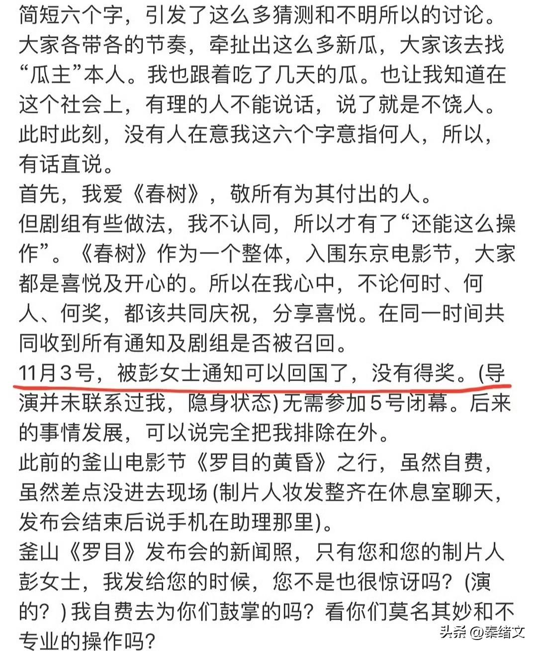 白百何东京电影节闹翻了!发文暗讽+缺席领奖,长文控诉剧组太劲爆! 东京电影节这瓜吃得人眼花缭乱!白百何先是发微博“还能这么操作…”配三捂表情包,又在朋友圈甩“得鱼忘筌”,这明晃晃的暗讽,到底是跟谁杠上了? 作为《春树》女主角,她本该亮相闭幕式,结果提前回国缺席颁奖礼,转头剧组就拿下最佳导演和最佳男演员两项大奖,这时间差也太巧了,难免让人多想里面有猫腻。 11月6日白百何直接发长文撕破脸,说11月3日被制片人彭瑾告知“没获奖能回国”,可剧组明明后来拿了奖,却没召回她去领奖,把主演彻底排除在外,这操作确实够让人膈应。 网友一下子炸了锅,有人说剧组太不地道,得了奖就把主演甩一边,典型的过河拆桥;也有人猜是不是中间有沟通误会,毕竟颁奖礼前获奖信息可能没完全确定。 要知道一部电影能获奖,主演的表演功不可没,白百何作为女主角,没功劳也有苦劳,就算没拿个人奖,跟着剧组共享荣誉也合情合理,被这么硬生生排除确实说不过去。 再看她朋友圈的“得鱼忘筌”和过河拆桥漫画,意思再明显不过,就是觉得剧组成功后忘恩负义,把她这个主演抛在脑后。换谁遇到这种事,心里都得憋着一股火。 但也有不同声音,说颁奖礼前获奖名单保密,制片人可能一开始也不确定能否获奖,让她先回国或许是正常安排,只是后续沟通没跟上,没必要上升到“忘恩负义”。 不管真相是沟通失误还是刻意为之,这事都暴露了娱乐圈的现实:利益面前,人情有时候真不算啥。但剧组这么做确实不妥,毕竟团队合作的成果,不该把核心主演排除在外。 白百何的遭遇也给圈里人提了个醒:合作前得把规则说清楚,后续有变动及时沟通,别搞藏着掖着那套,不然赢了奖项丢了口碑,最后得不偿失。 娱乐圈名利场向来复杂,但再怎么逐利也得讲基本的尊重和道义。希望这事能有个合理说法,也盼着行业里少点这种糟心事,多点真诚合作,毕竟好作品离不开每个人的付出!