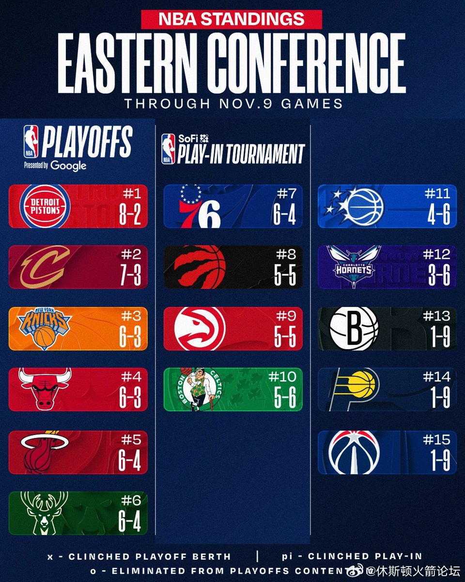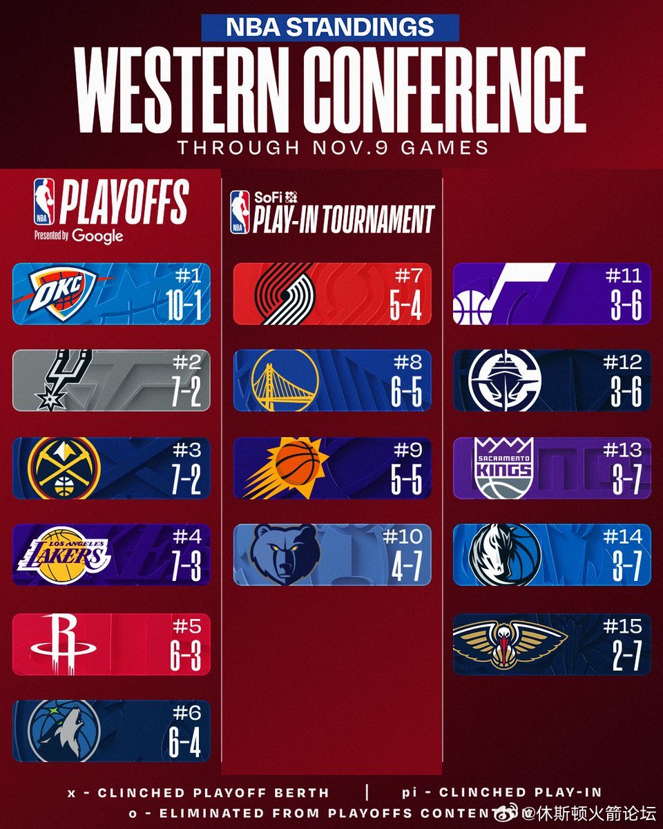 东西部最新排名!活塞雷霆分列东西部第一,火箭6胜3负位列西部第五。休斯顿火箭 ​​​