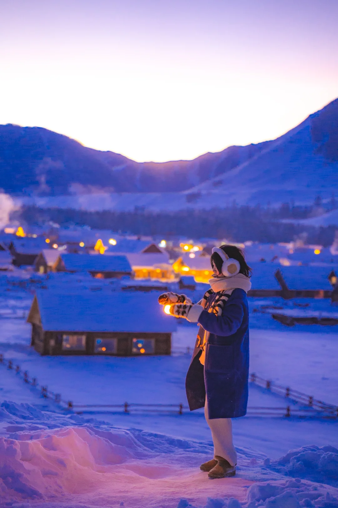 比村子稍高的视觉,可以拍到一排排的木屋与人的合照,蓝调时刻偶然遇到狗子陪我一起等待村子华灯初上,真的太喜欢了!