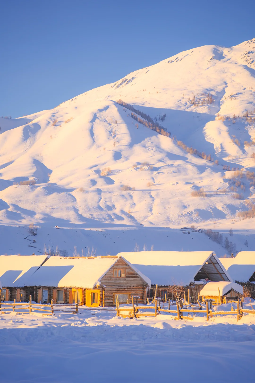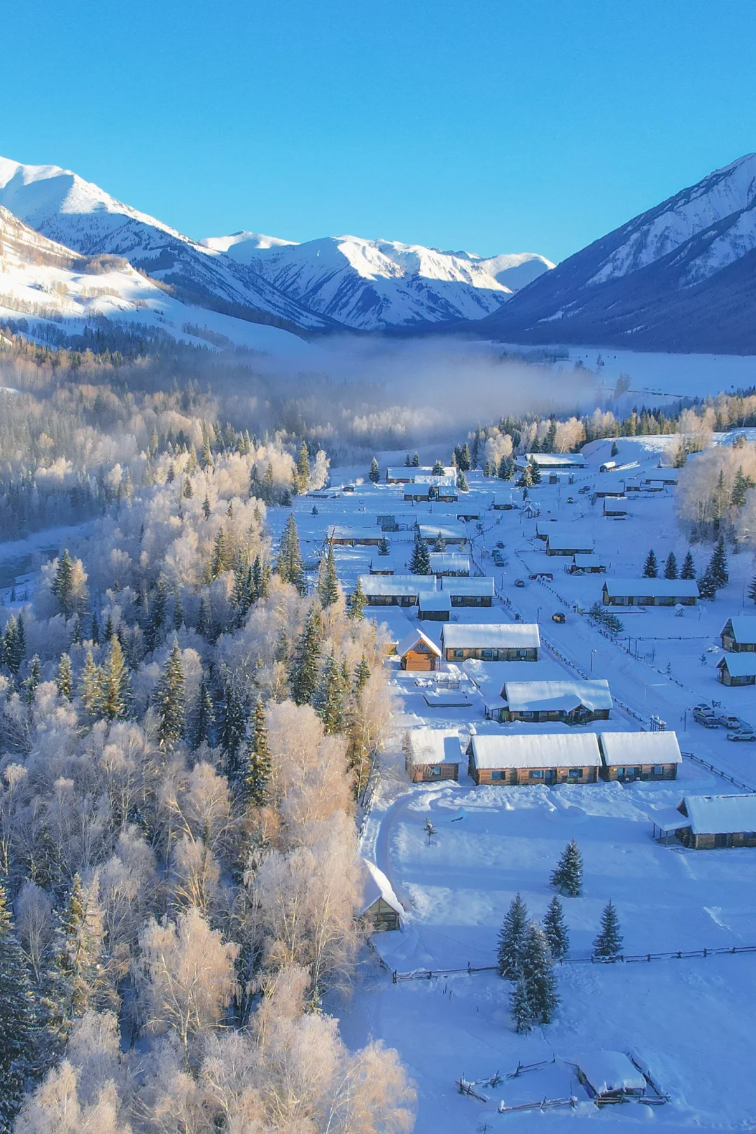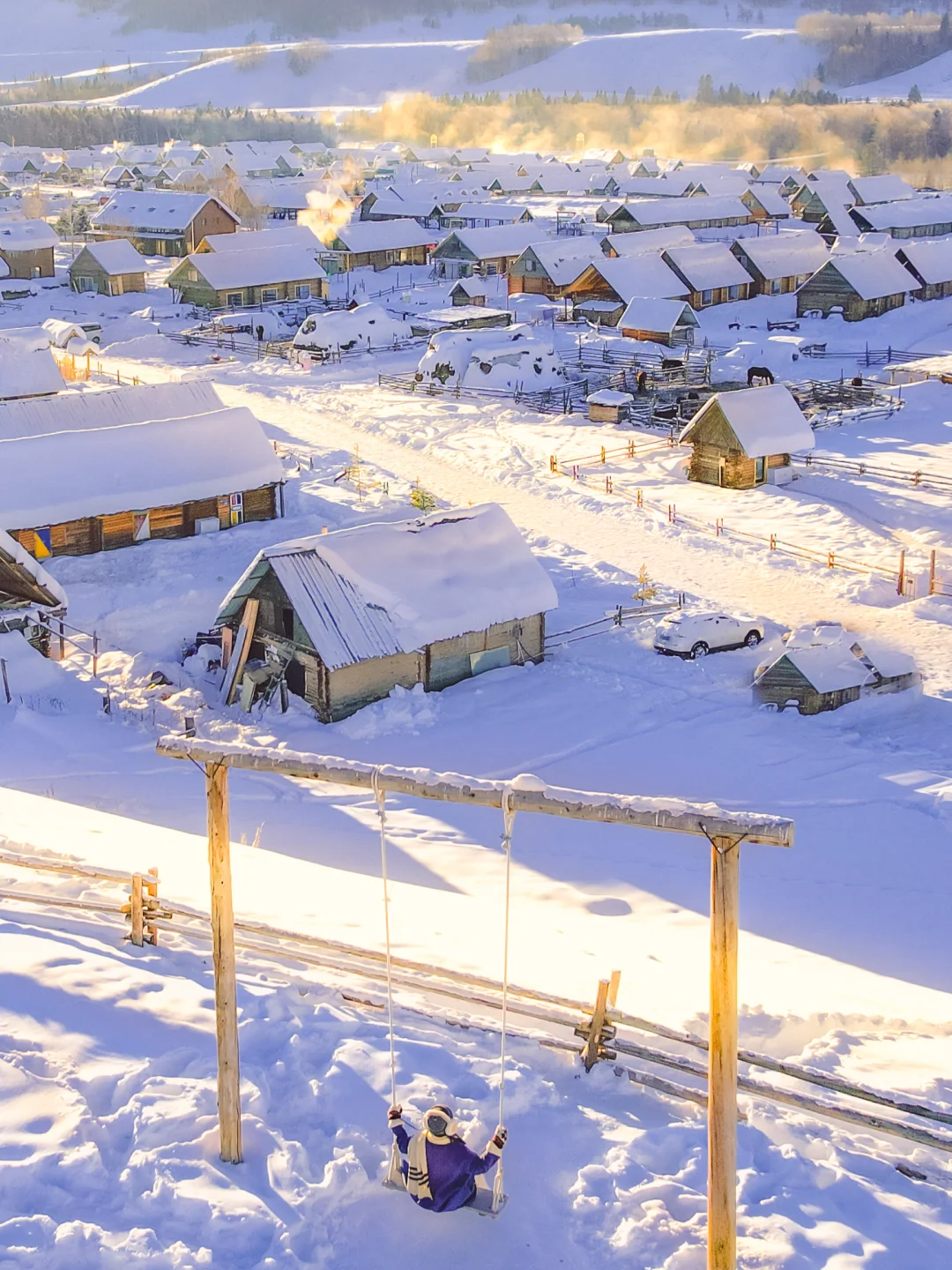 而且新疆冬季本身就是接近10点才日出,想要拍摄效果更好需要等阳光打到村子后,大概需要11点后,所以不用早起也能享受美景,很爽~